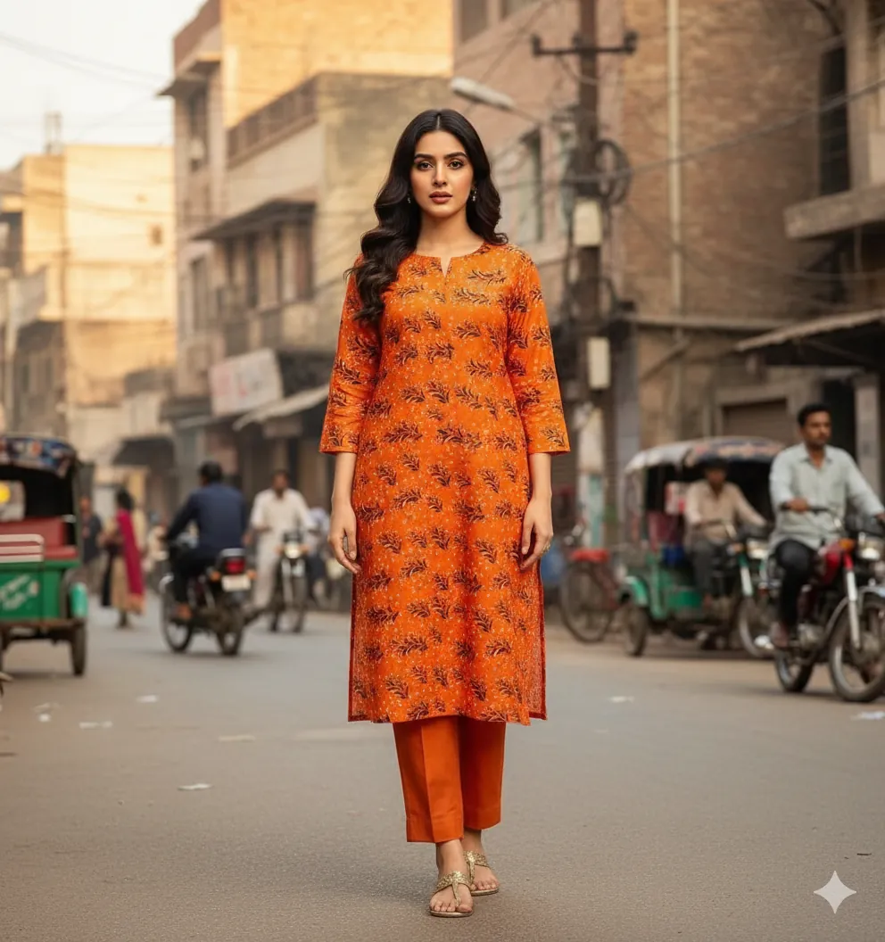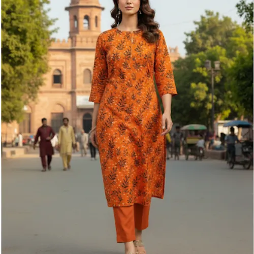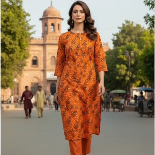 Unstitched 2-Piece Linen Suit: Bright Orange with Subtle Floral Print. This vibrant 2-piece unstitched linen suit features a bright orange base with a subtle digital print of dark floral elements, complemented by a solid orange dyed trouser.Elevate your style with this vibrant unstitched 2-piece linen suit. The dominant background color of the main fabric is a bright orange, featuring a subtle digital print of dark-toned floral and leaf-like elements, without a prominent white color. The accompanying "Dyed Trouser" fabric is a plain orange hue, creating a harmonious, monochromatic look. Crafted from high-quality 68/72 linen, this ensemble is both comfortable and durable, perfect for the Sargodha climate.