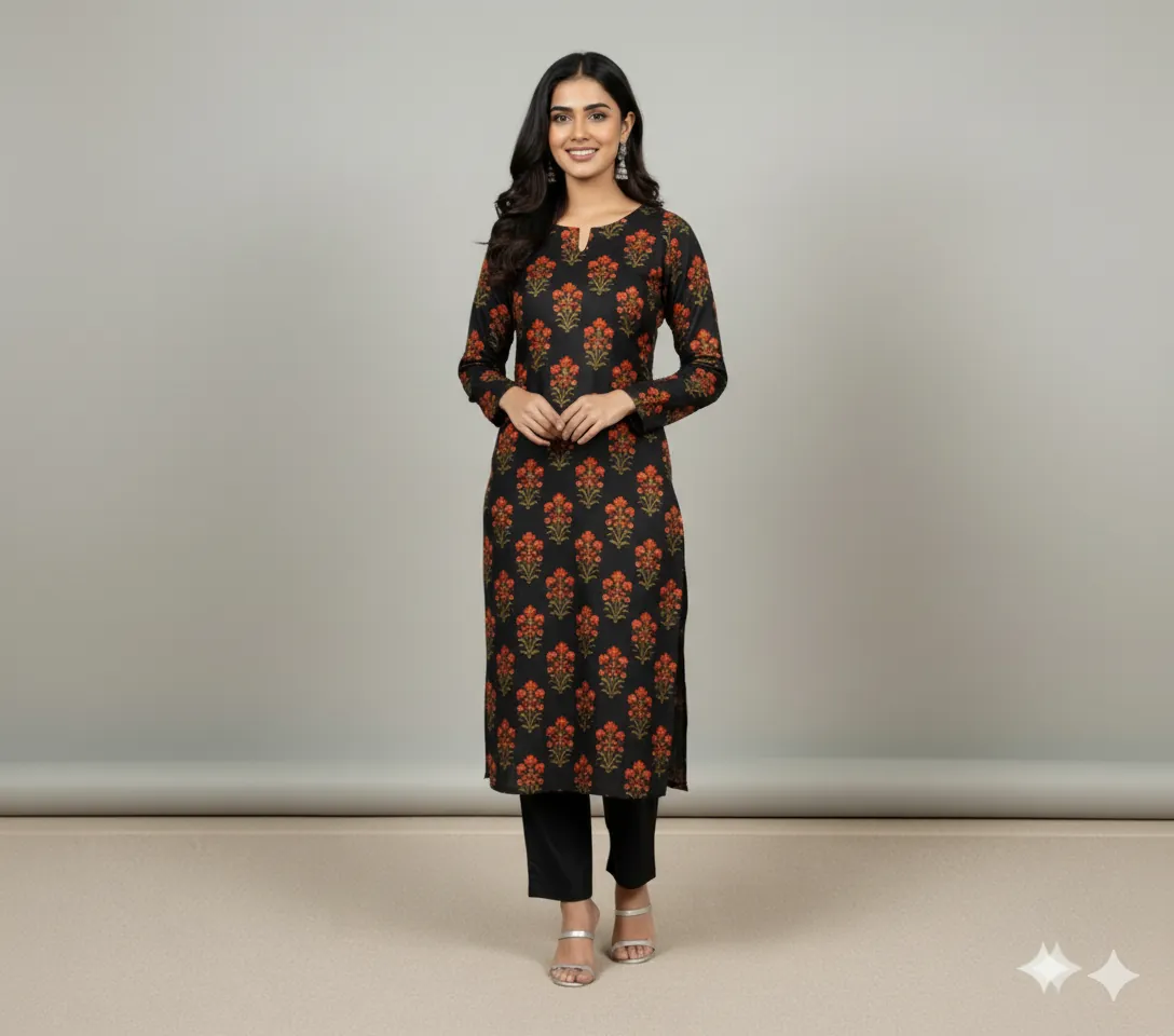The suit includes a printed shirt and a coordinating dyed trouser in a solid black or dark brown color, creating a sharp and elegant contrast. The soft and comfortable fabric makes it an ideal choice for the cooler seasons. This suit's unique print and high-quality material make it a perfect addition to any wardrobe.