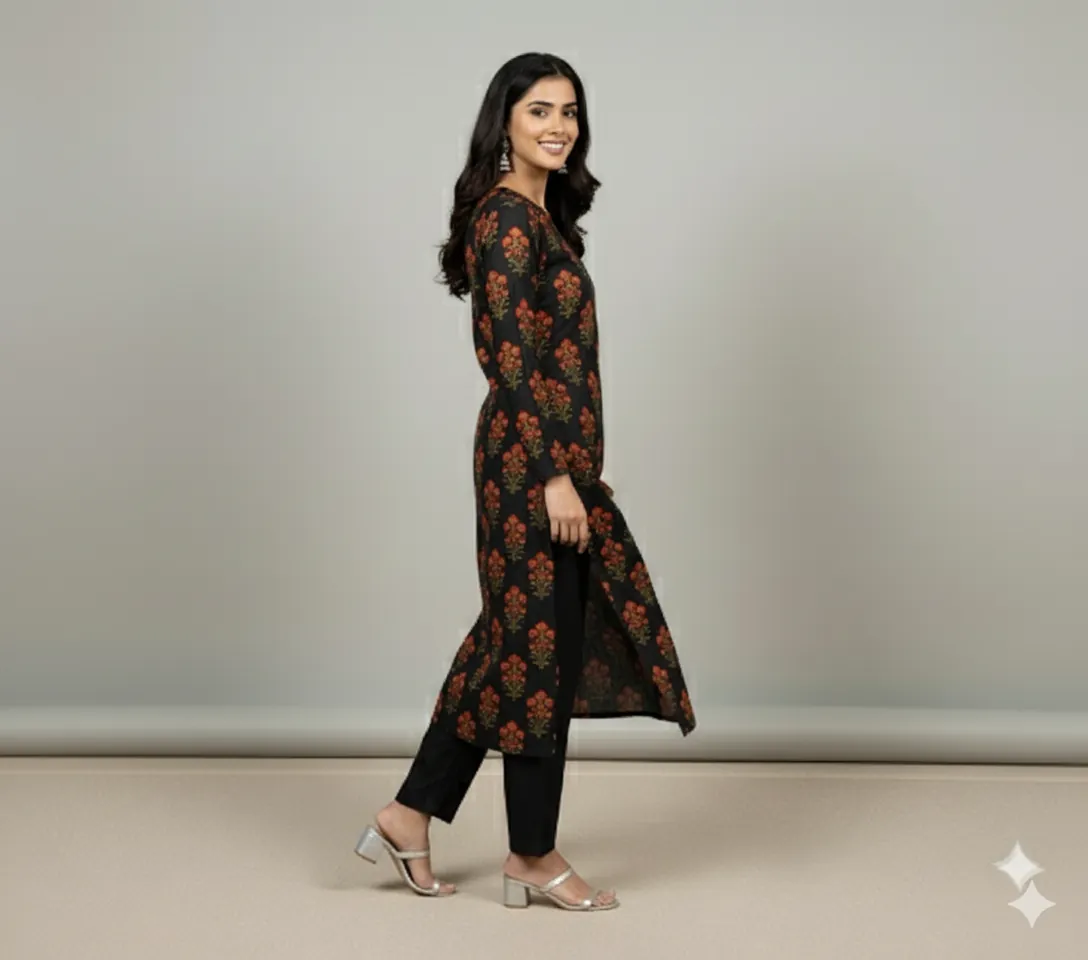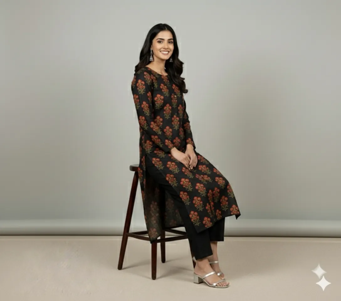 Unstitched 2-Piece Linen Suit: Dark Brown & Red Floral Print. This elegant 2-piece unstitched linen suit features a dark brown base with a beautiful digital print of red and orange flowers, perfect for a sophisticated look.Discover timeless style with this gorgeous unstitched 2-piece linen suit. Crafted from high-quality 68/72 linen, this ensemble features a rich dark brown base adorned with a detailed digital print of intricate floral and leaf patterns in shades of red, orange, and beige.