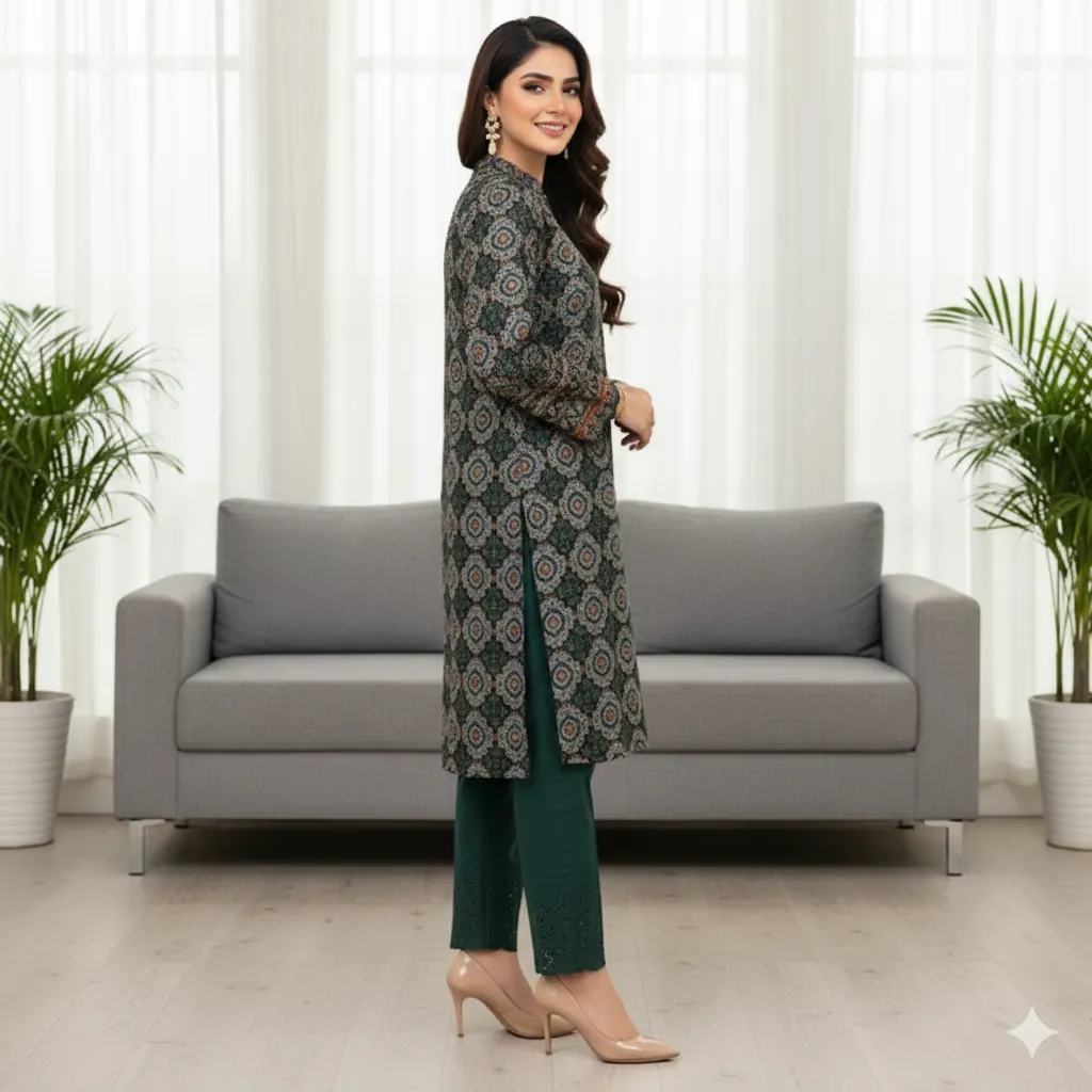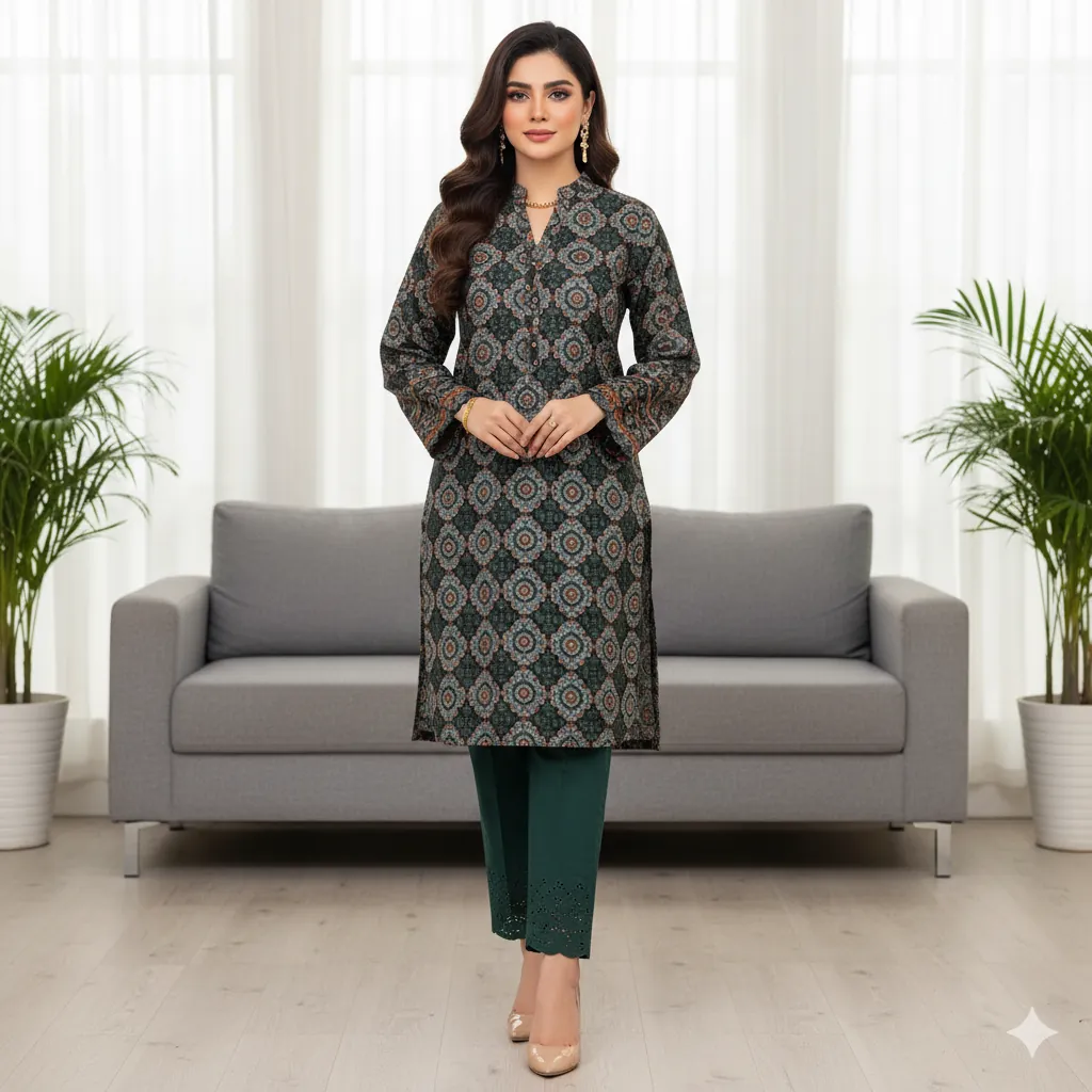 . Unstitched 2-Piece Linen Suit: Dark Grey with Geometric and Floral Print. An elegant unstitched linen suit featuring a dark grey base with a geometric and floral digital print in shades of orange and beige, paired with a solid dark grey dyed trouser.This unstitched suit is crafted from "Linen" with a "Quality 68/72" rating. The shirt fabric has a dark grey base, adorned with a digital print that combines a repeating geometric pattern with stylized orange and beige floral motifs. The set is completed with a "Dyed Trouser" in a solid dark grey color, perfectly complementing the print. This unstitched suit is a sophisticated choice for custom tailoring, offering a unique blend of modern geometry and classic floral design.