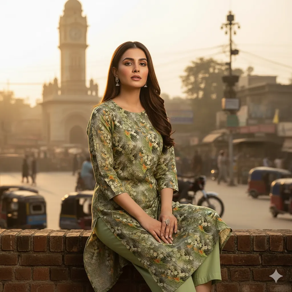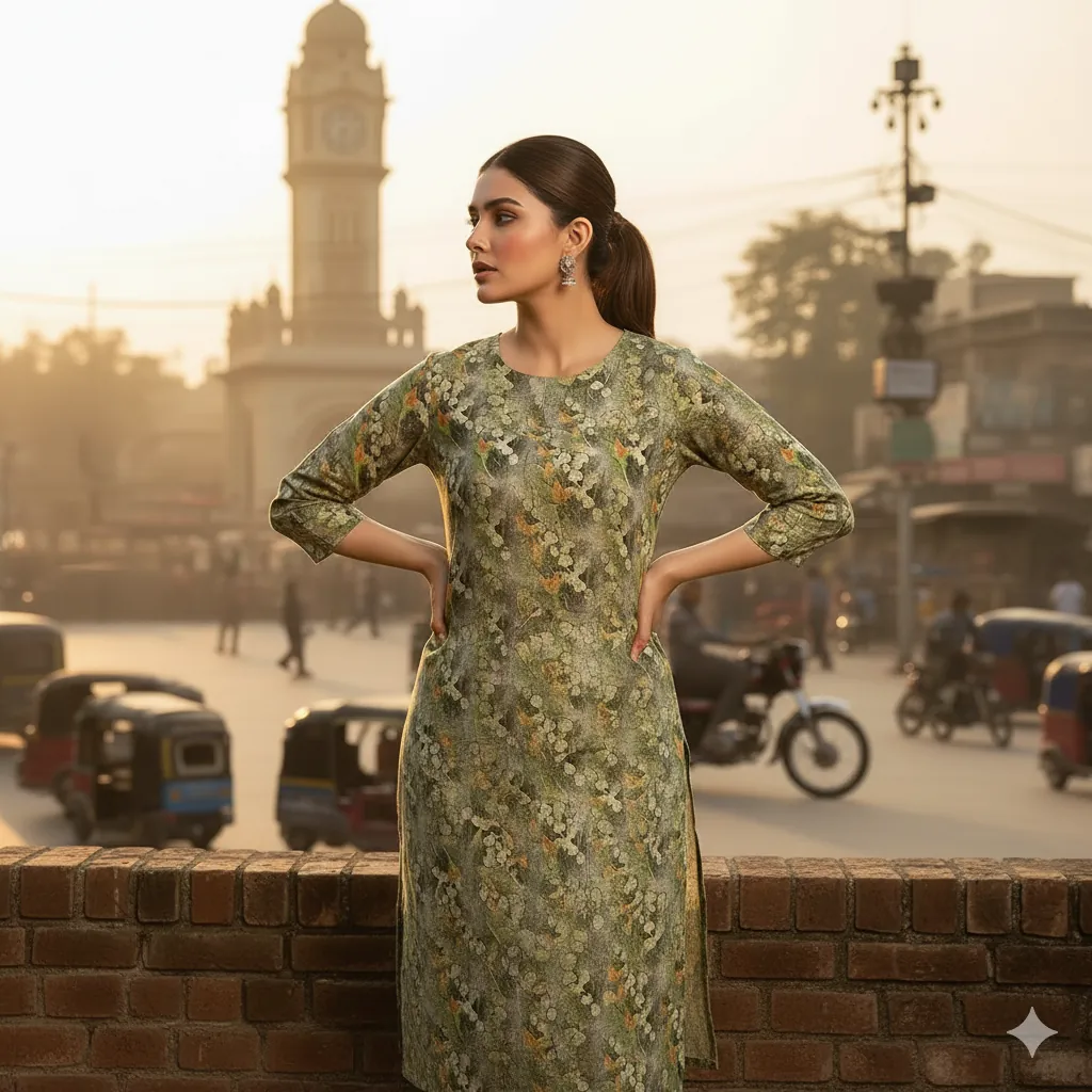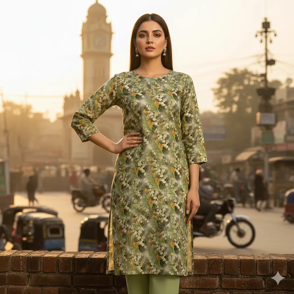 The suit includes a printed shirt and a coordinating light green dyed trouser, creating a subtle and chic contrast. The soft and comfortable fabric makes it an ideal choice for both daily wear and casual gatherings. This suit's unique color palette and high-quality material make it a standout piece for any wardrobe.
