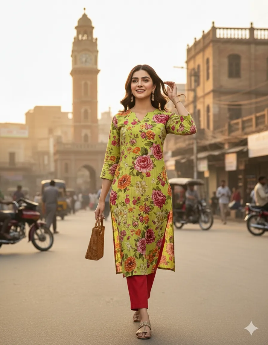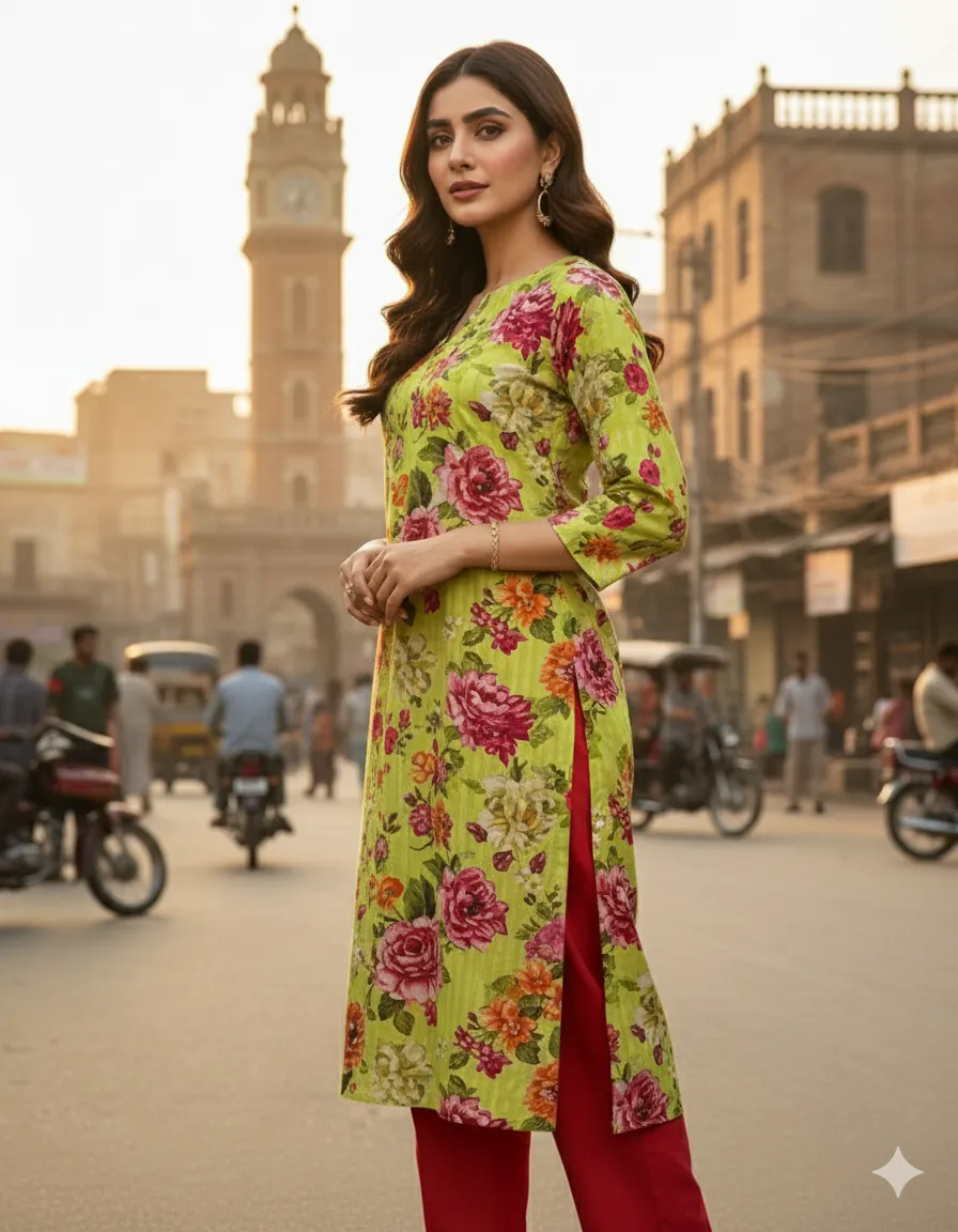 Unstitched 2-Piece Linen Suit: Lime Green with Pink Floral Print. This vibrant 2-piece unstitched linen suit features a bright lime green base with a delicate digital print of pink and red flowers, complemented by a solid magenta trouser.Elevate your style with this beautiful unstitched 2-piece linen suit. Crafted from high-quality 68/72 linen, this ensemble features a bright lime green base adorned with a digital print of large, intricate floral patterns in lively shades of pink, red, and white.