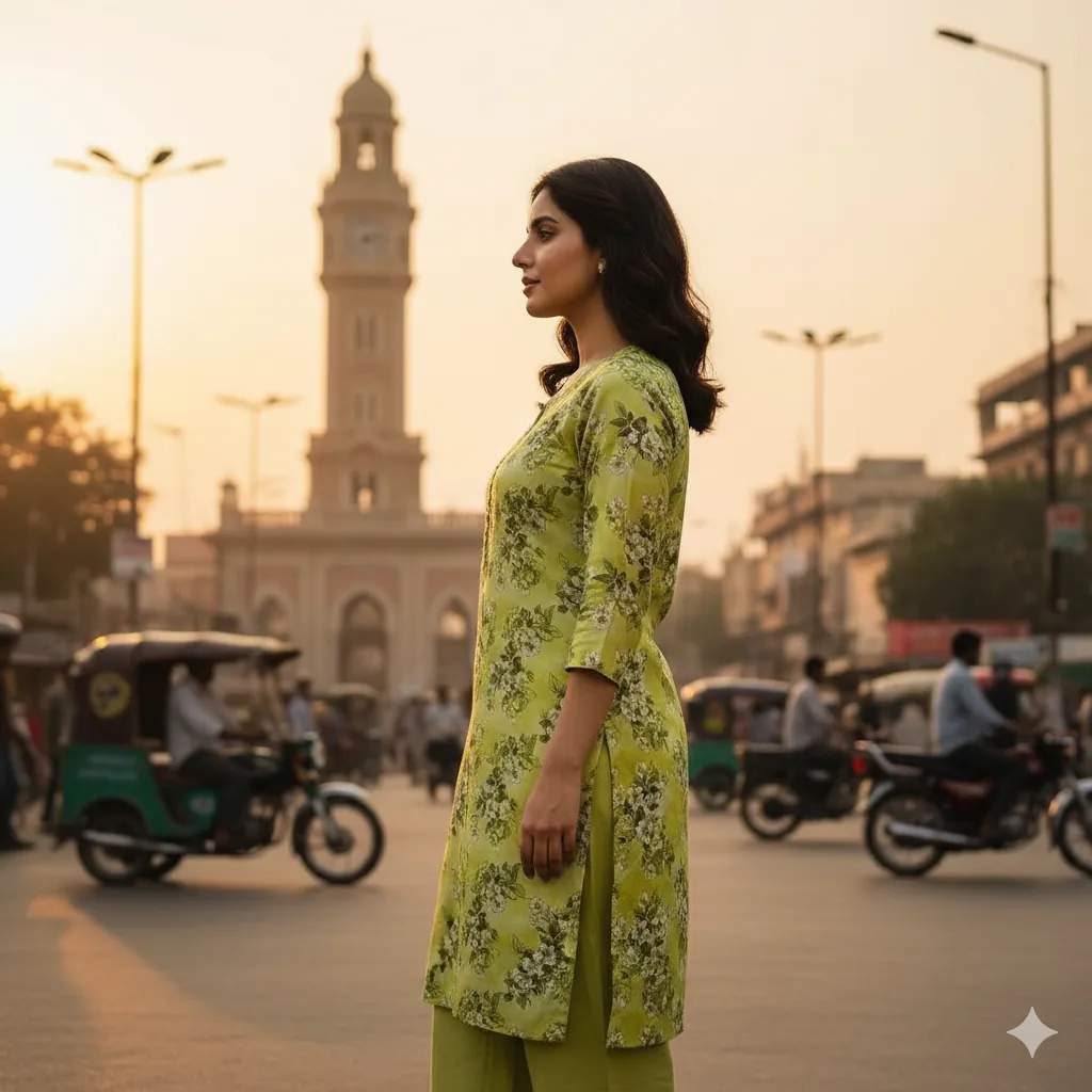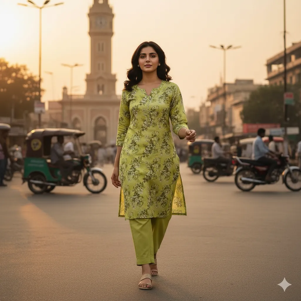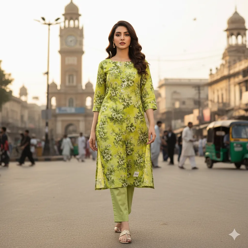 Unstitched 2-Piece Linen Suit: Lime Green with White Floral Print. This fresh 2-piece unstitched linen suit features a bright lime green base with a delicate digital print of white floral motifs, complemented by a solid yellow dyed trouser.Discover a vibrant and refreshing style with this beautiful unstitched 2-piece linen suit. The color of the linen fabric in the image can be described as Lime Green or a similar shade of light, bright green. This cheerful base is adorned with a delicate digital print of small white floral motifs and subtle hints of greenery, creating a light and airy feel perfect for the Sargodha weather.