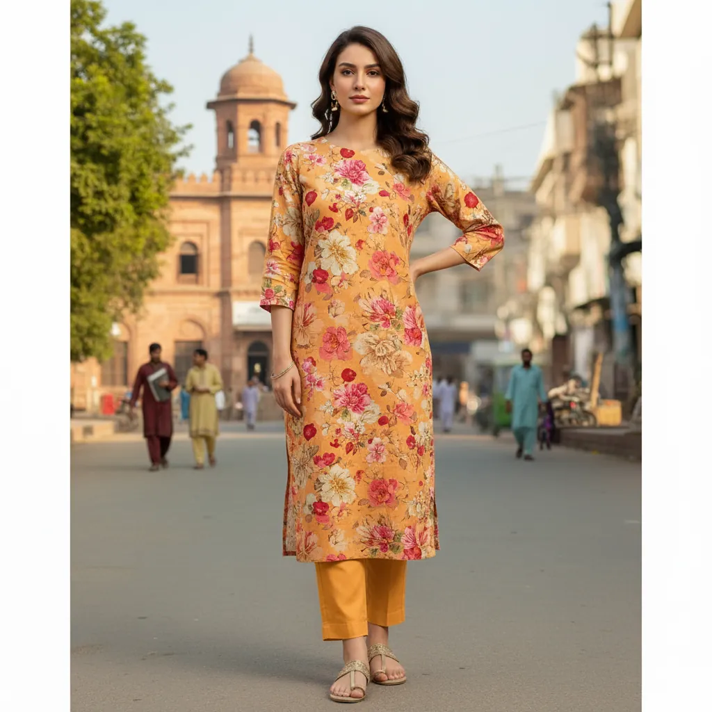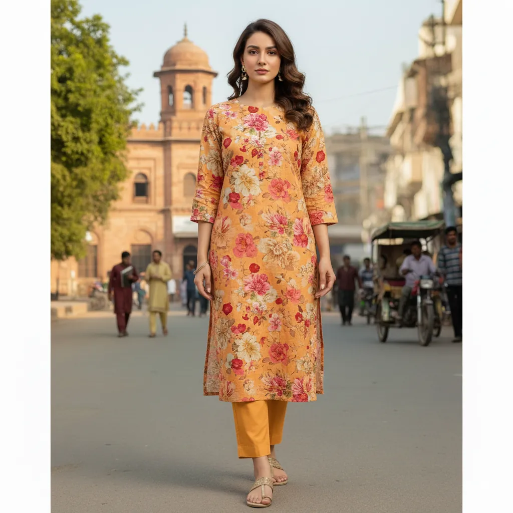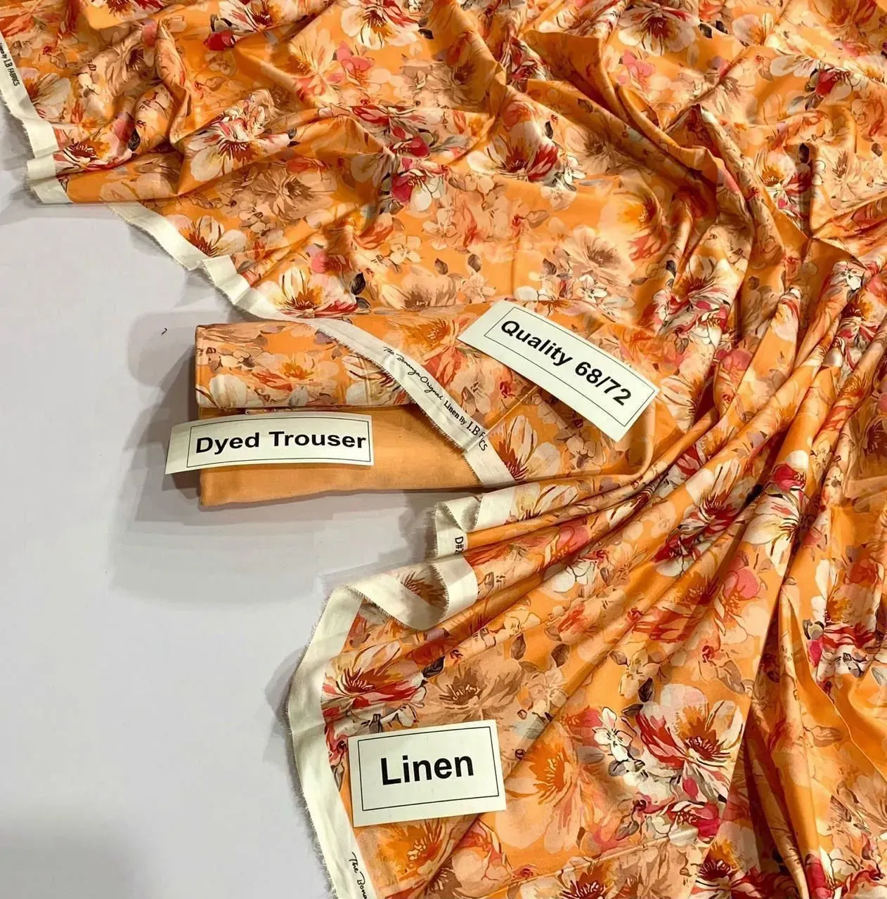 Unstitched 2-Piece Linen Suit: Orange with Pink & White Floral Print. This lovely 2-piece unstitched linen suit features a bright orange base with a delicate digital print of pink and white flowers, complemented by a solid orange dyed trouser.Elevate your style with this beautiful unstitched 2-piece linen suit. Crafted from high-quality 68/72 linen, this ensemble features a vibrant orange base adorned with a digital print of large, intricate floral patterns in lively shades of pink, white, and yellow.