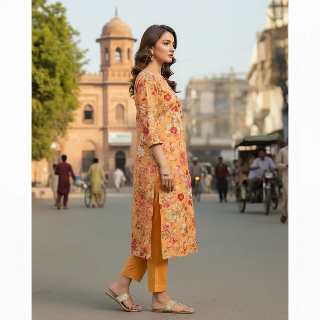 The suit includes a printed shirt and a coordinating dyed trouser in a solid orange color, creating a beautiful, monochromatic look. The soft and comfortable linen fabric ensures a beautiful drape and feel, making it an ideal choice for both daily wear and casual gatherings. This suit's vibrant color palette and high-quality material make it a perfect addition to any wardrobe.