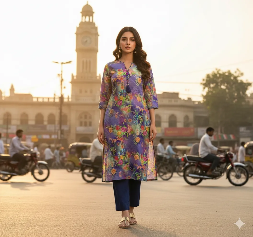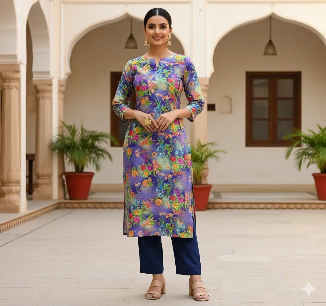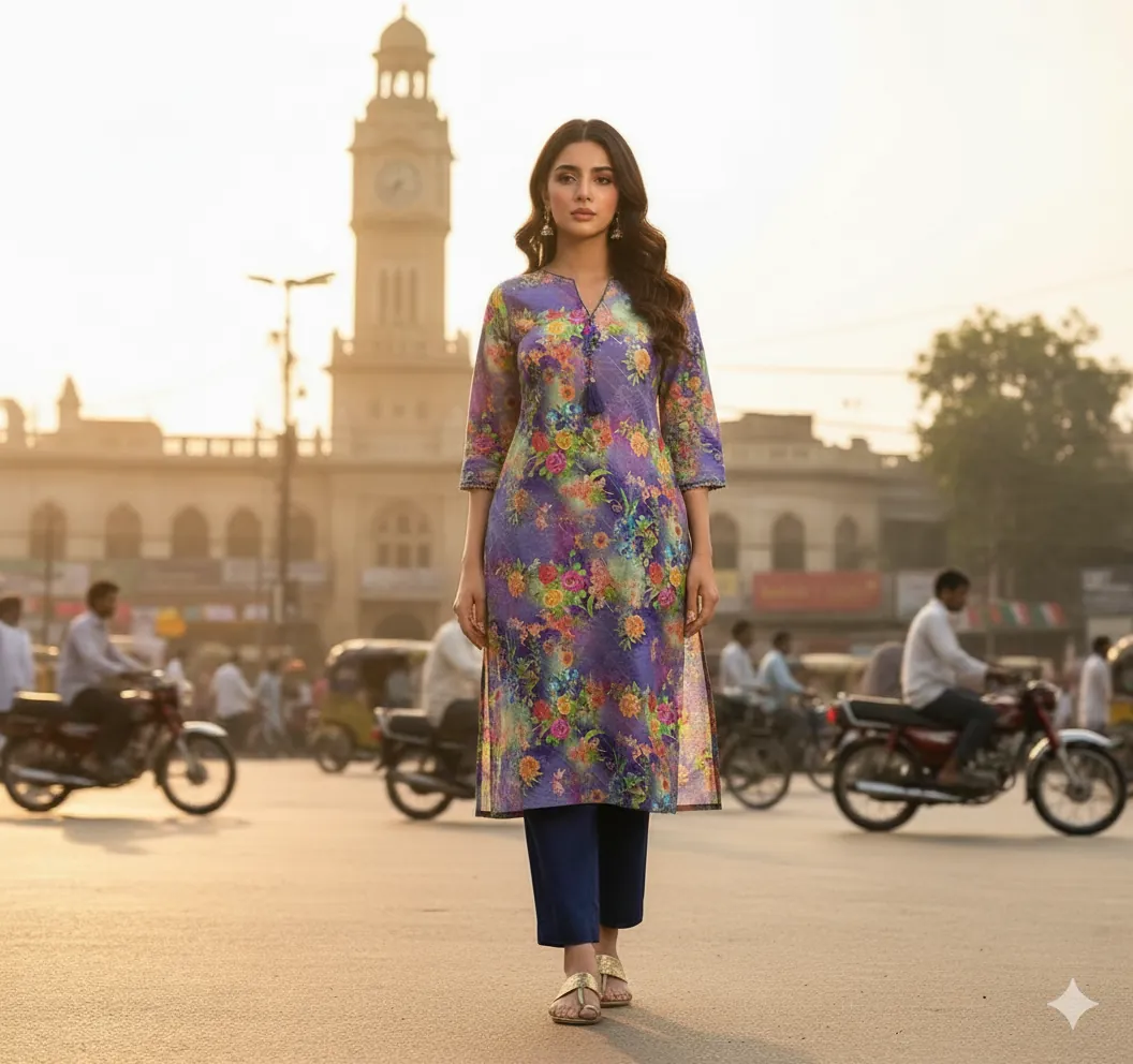 Unstitched 2-Piece Linen Suit: Purple & Multi-Color Floral Print. This vibrant 2-piece unstitched linen suit features a purple base with a beautiful digital print of multi-colored flowers, complemented by a solid navy trouser.Make a bold and elegant statement with this stunning unstitched 2-piece linen suit. Crafted from high-quality 68/72 linen, this ensemble features a vibrant purple base adorned with a beautiful digital print of floral and abstract patterns in shades of orange, yellow, blue, and green.