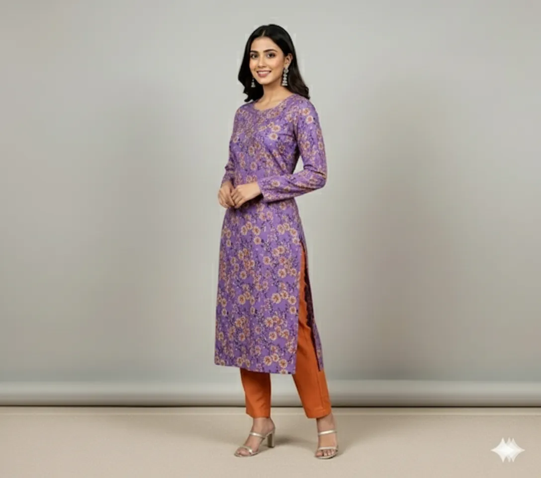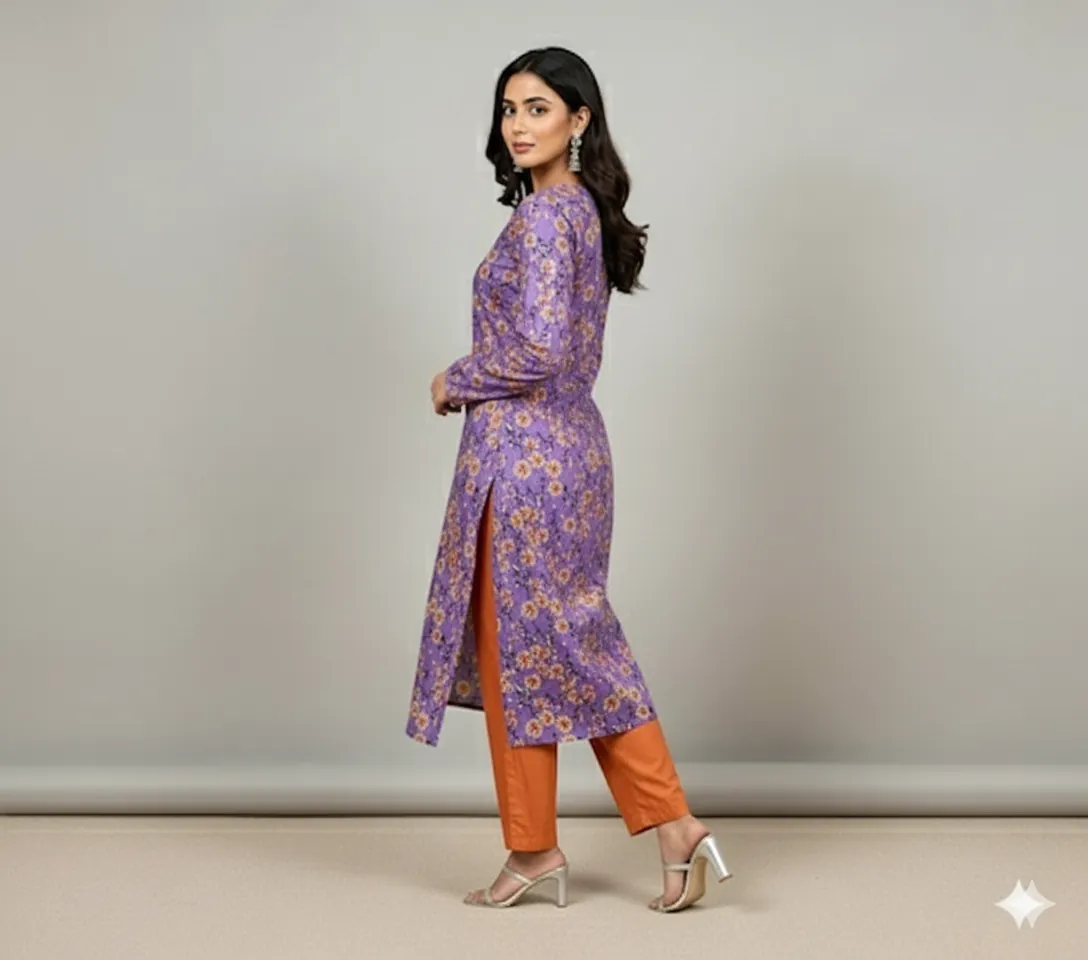 Unstitched 2-Piece Linen Suit: Purple with Yellow Floral Print. This lovely 2-piece unstitched linen suit features a purple base with a delicate digital print of yellow and orange flowers, complemented by a solid red dyed trouser.Discover charming and graceful style with this beautiful unstitched 2-piece linen suit. Crafted from high-quality 68/72 linen, this ensemble features a soft purple base adorned with a digital print of small, scattered flowers in lively shades of yellow and orange.