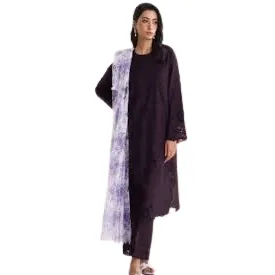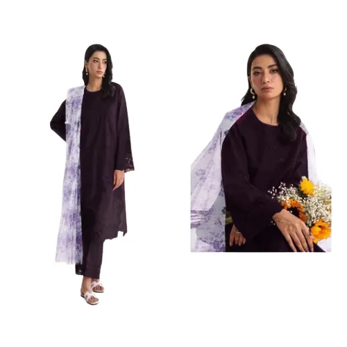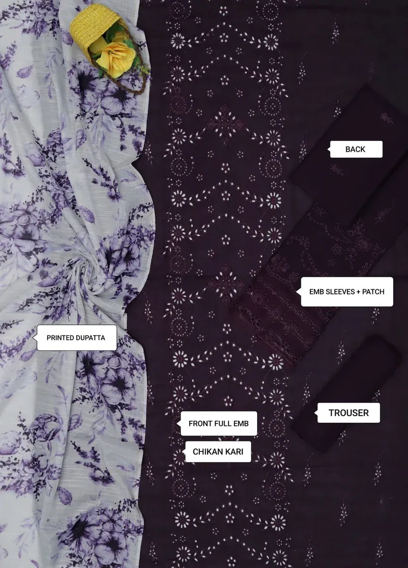 Unstitched 3-Piece Chikankari Suit – Plum with Floral Print Dupatta timeless style with this stunning 3-piece unstitched chikankari suit. The rich plum-colored fabric is the perfect canvas for the intricate full-front embroidery, adding a touch of traditional craftsmanship and modern elegance. The ensemble is elevated by a beautiful floral printed chiffon dupatta in a coordinating light color, creating a striking contrast. The suit also includes embroidered sleeves with a patch and a plain trouser to complete the look. This versatile outfit is ideal for formal gatherings, festive occasions, or a special evening out. Customize it to your perfect fit and showcase a sophisticated and graceful style.