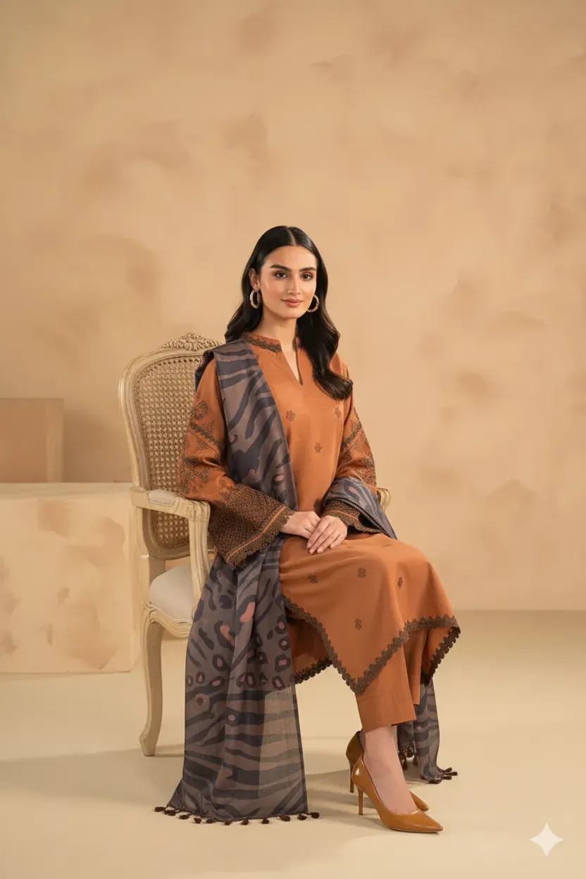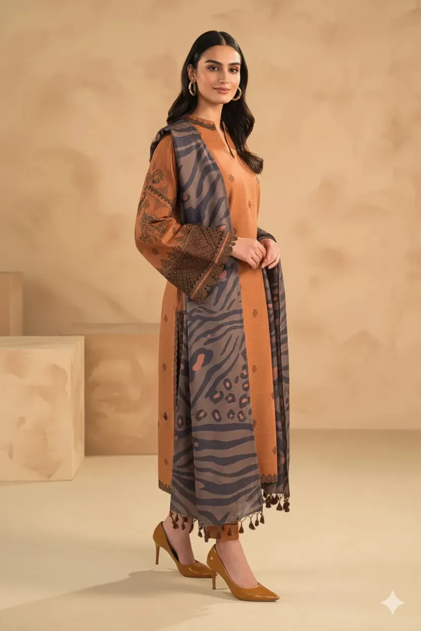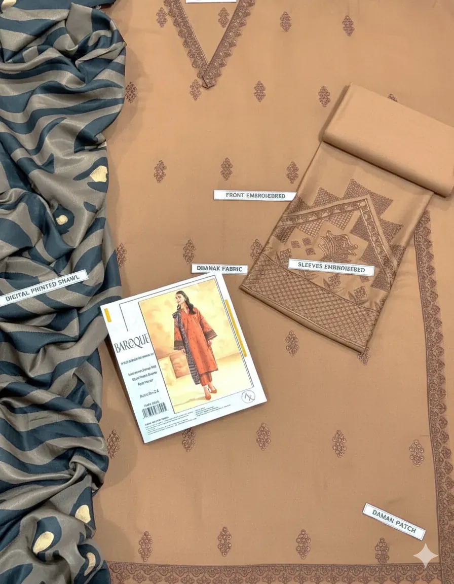 This BAROQUE Unstitched 3-Piece Dhank Suit, Article 24, is the epitome of winter style and sophistication. The luxurious Dhank fabric, in a warm and inviting rust color, offers a soft feel and excellent drape. The shirt is meticulously detailed with intricate, self-colored embroidery, including a beautiful neck patch, scattered motifs on the front, and a unique geometric embroidered pattern on the sleeves. A matching embroidered daman patch completes the look, adding a refined finish. The ensemble is elevated by a standout digital printed shawl, featuring a modern, abstract animal print in shades of dark brown and black, providing a chic and contemporary contrast. This unstitched suit provides the ultimate flexibility to be tailored to your precise measurements and design preferences, making it a perfect choice for festive gatherings, formal events, or a stylish daily look.
