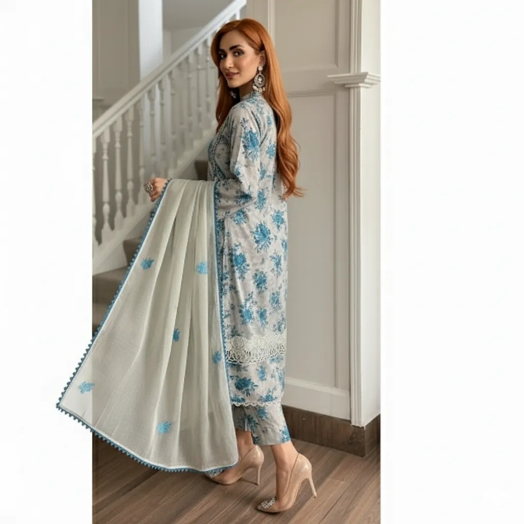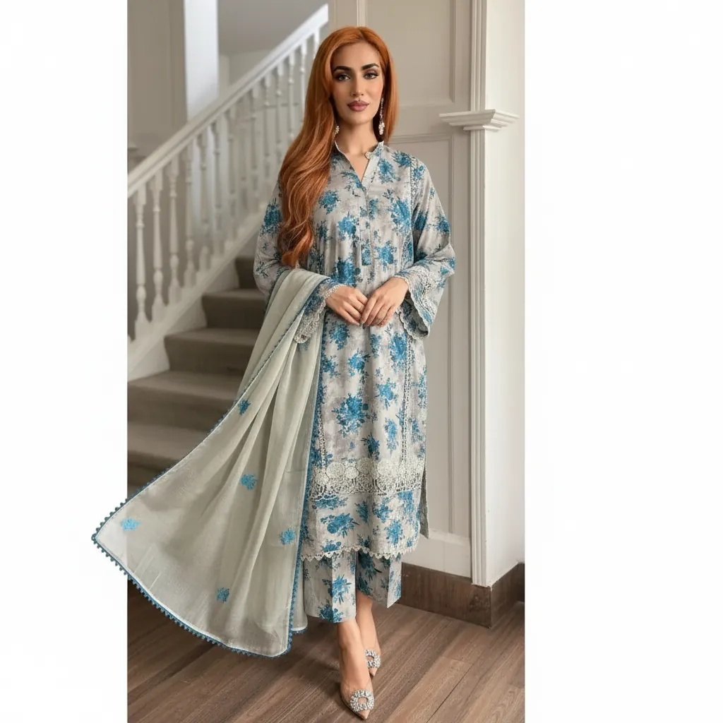 Unstitched 3-Piece Lawn Suit – Gray with Blue Floral Print | Summer Collection. Discover timeless style with this exquisite 3-piece unstitched lawn suit, perfect for the summer season. The soft gray lawn fabric provides a sophisticated backdrop for the stunning blue floral print, creating a look that is both fresh and elegant. The front and back of the shirt feature this lovely design, while the sleeves are adorned with a stylish patch. The ensemble is completed with a matching printed lawn dupatta and a plain trouser, ensuring a cohesive and graceful outfit. Ideal for casual outings, daily wear, or light gatherings, this suit allows you to customize the fit for an effortlessly perfect look.