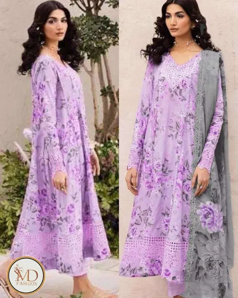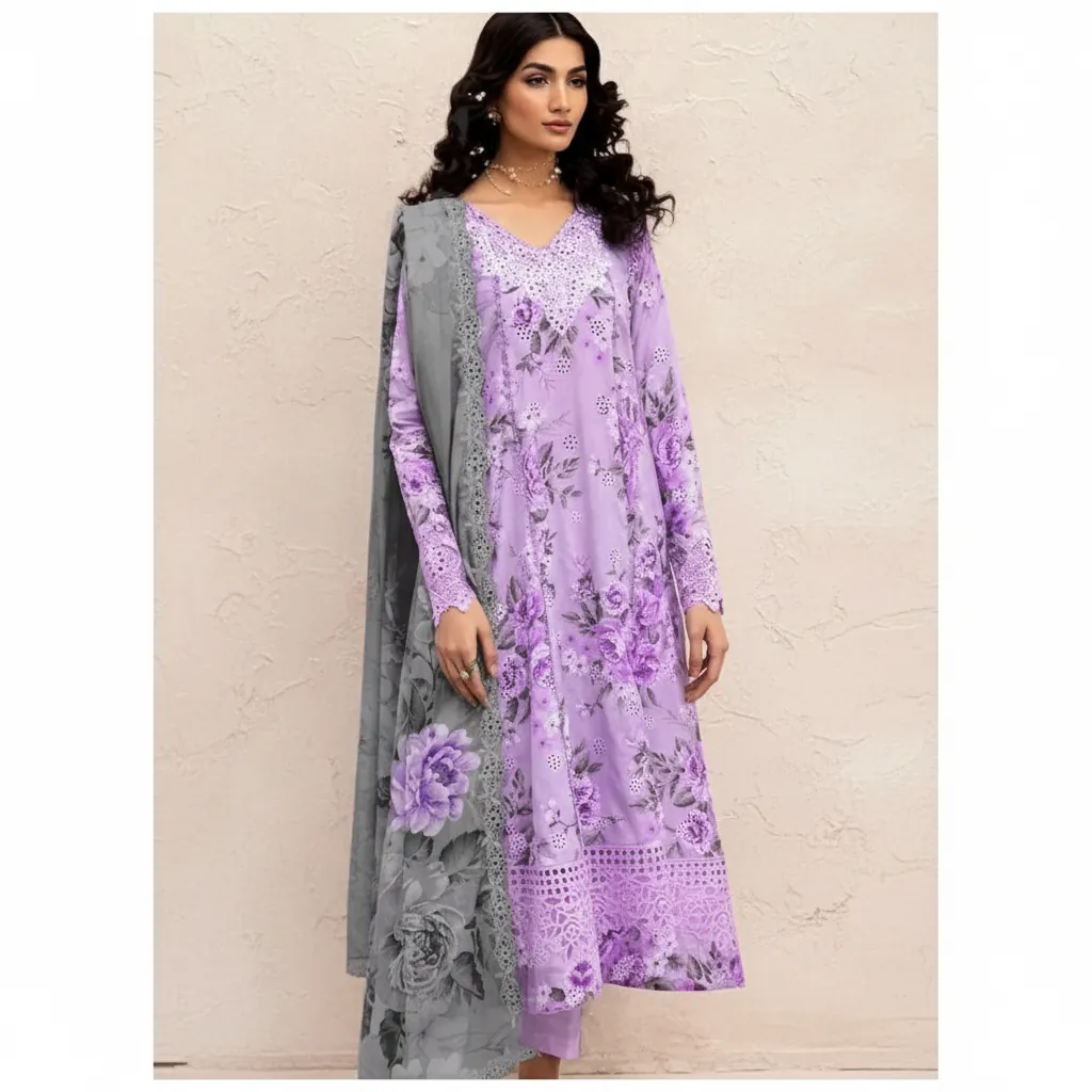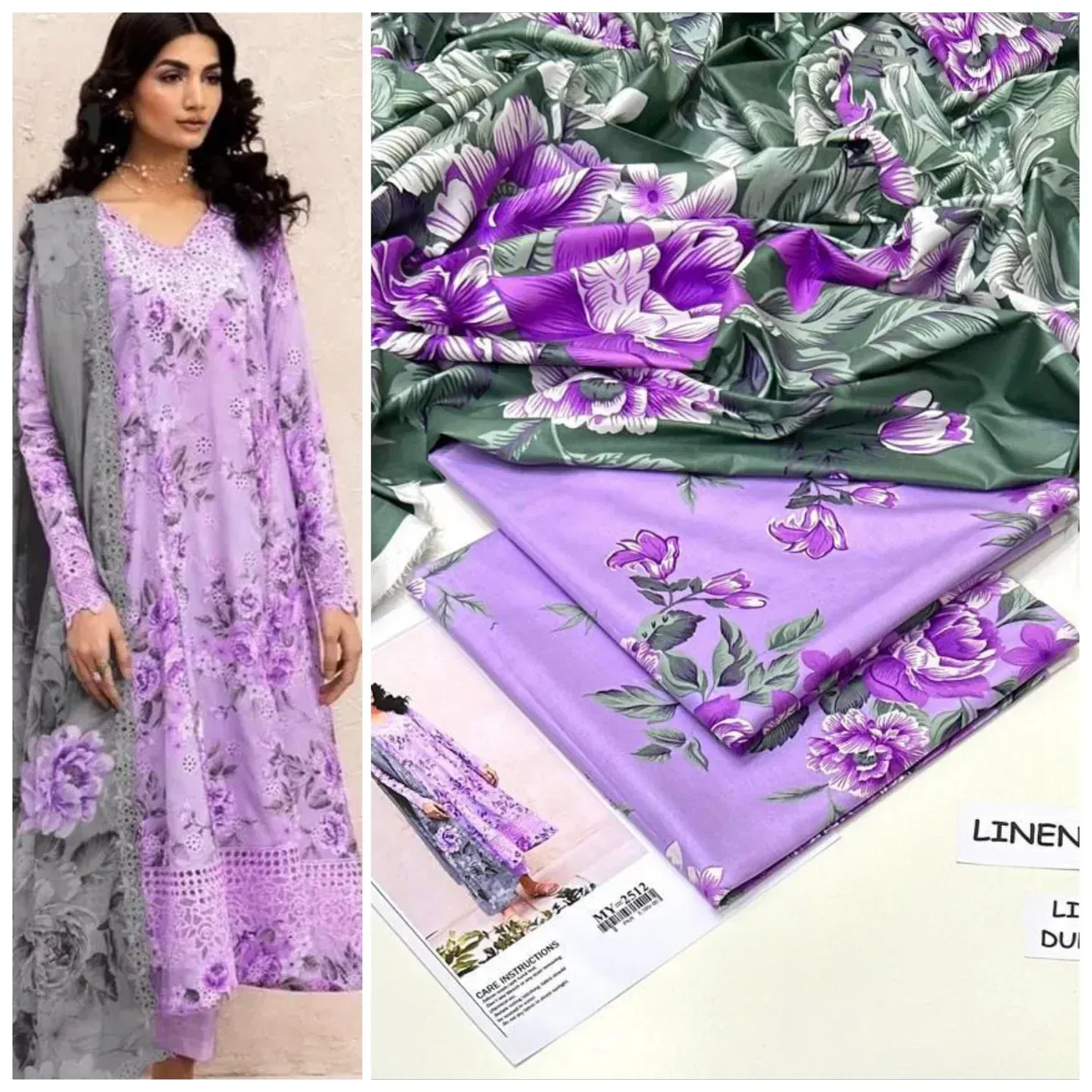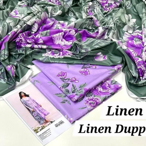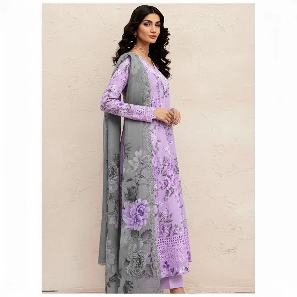 Unstitched 3-Piece Linen Suit: Lilac & Purple Floral Printed Shirt, Trouser & Dupatta. Step out in style with this gorgeous unstitched 3-piece linen suit, designed for both comfort and elegance. The ensemble features a light lilac linen shirt and a matching trouser, both adorned with a subtle floral digital print. The delicate pattern provides a soft and feminine base.
