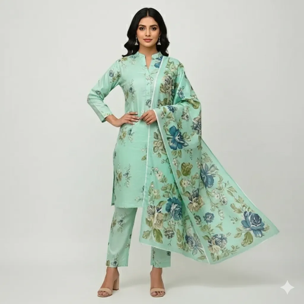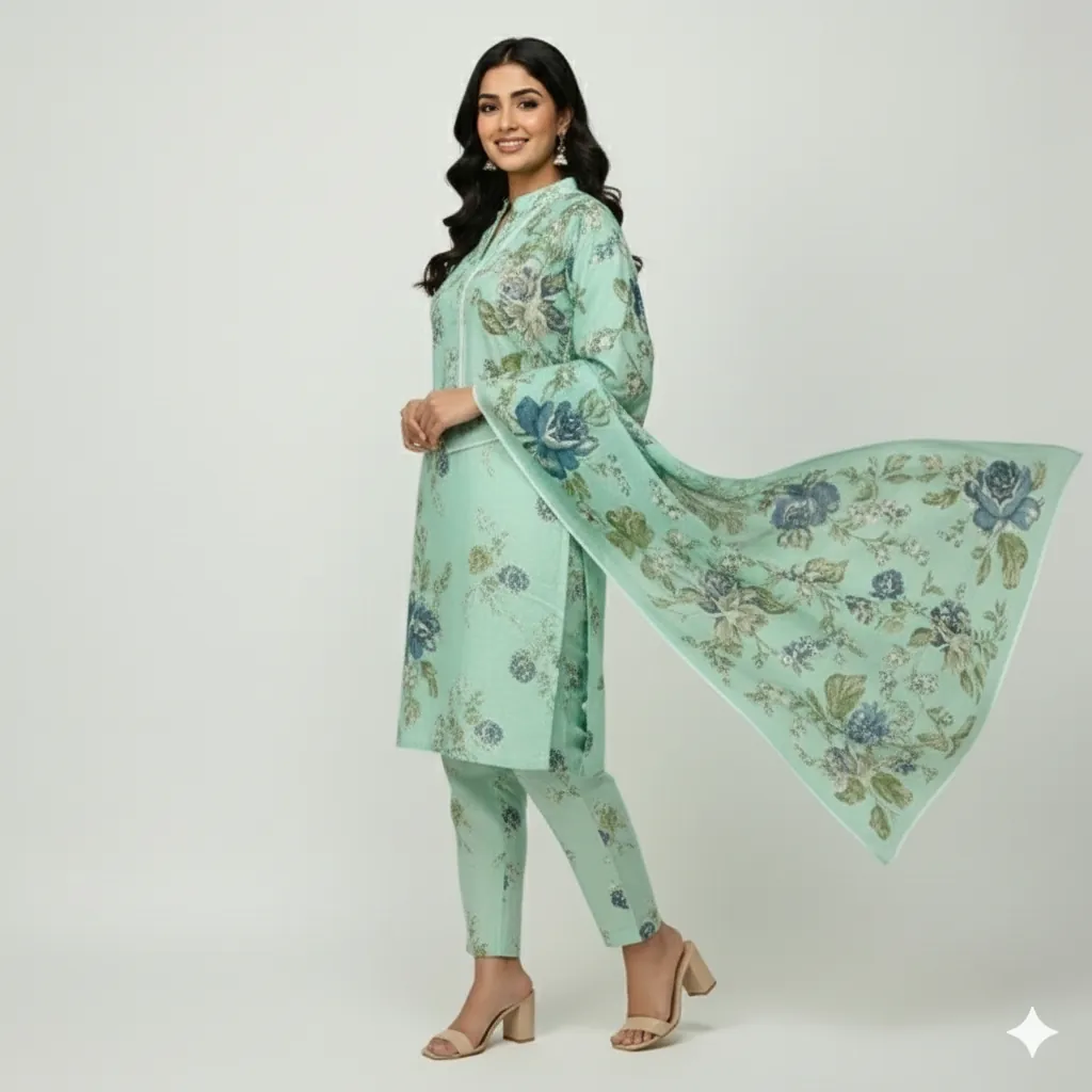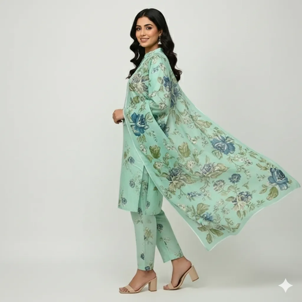 Unstitched 3-Piece Linen Suit - Mint Green Printed Shirt & Trouser with Blue & Pink Floral Printed Dupatta. This 3-piece unstitched linen suit features a mint green printed shirt and trouser with a beautiful blue and pink floral digital printed dupatta. Perfect for a stylish and comfortable look.This beautiful unstitched 3-piece linen suit is a perfect addition to your wardrobe, offering a blend of elegance and comfort. The ensemble features a mint green printed shirt and a matching printed trouser, both crafted from high-quality 72/72 linen fabric. The all-over print on the shirt and trouser creates a cohesive and stylish look.