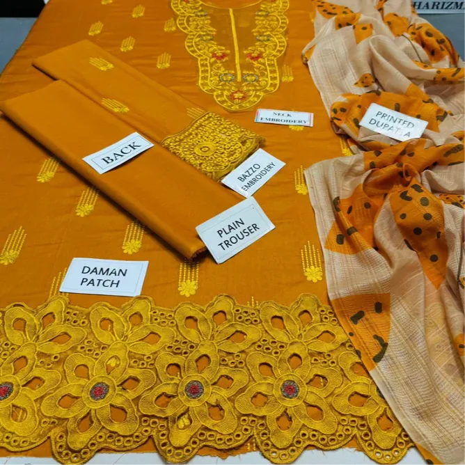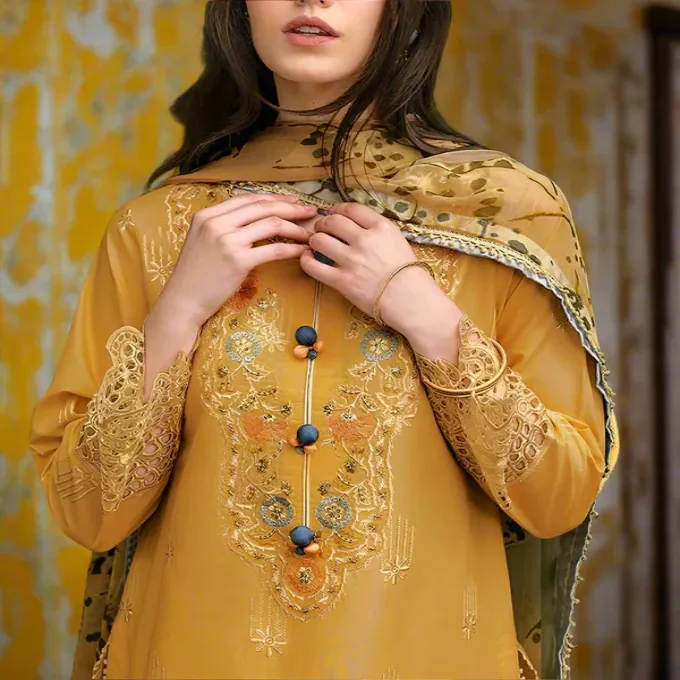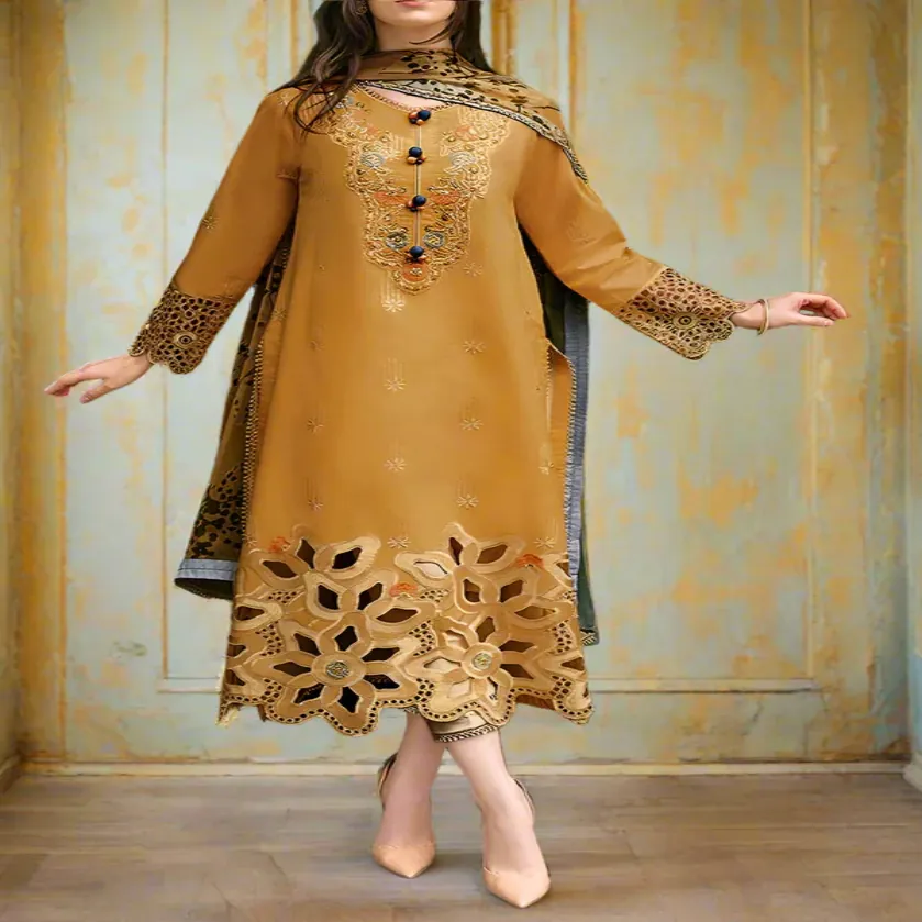 Unstitched 3-Piece Mustard Yellow Embroidered Suit with Cutwork and Printed Dupatta. A sophisticated unstitched 3-piece suit in a rich mustard yellow color. The ensemble features a heavily embroidered front with a stunning cutwork daman patch and a unique printed dupatta.