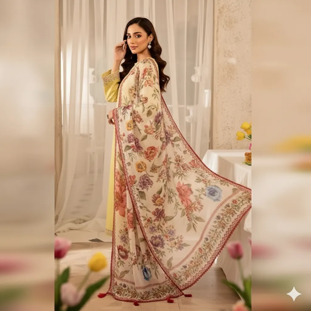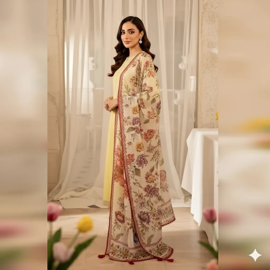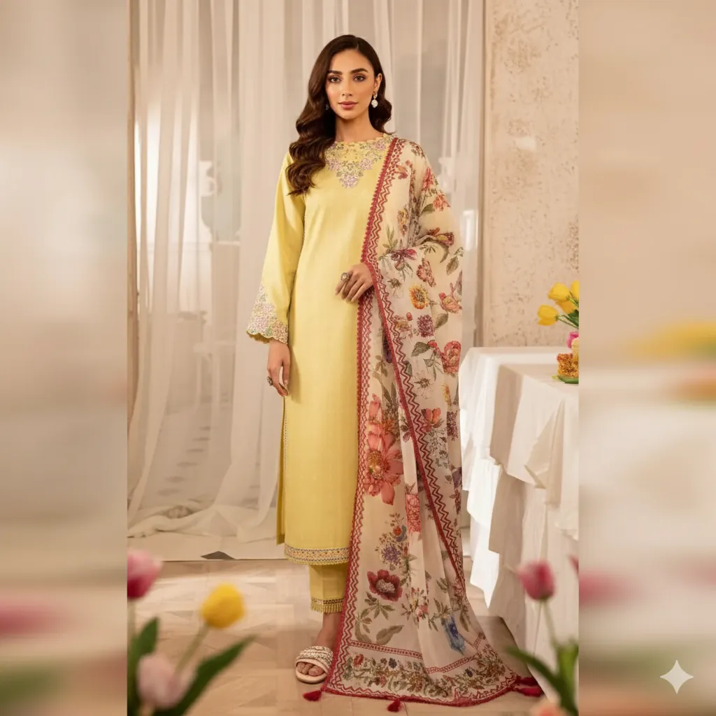 Unstitched 3-Piece Lemon Yellow Embroidered Suit with Multi-Color Daman Patch and Printed Dupatta. A vibrant unstitched 3-piece suit in a sunny yellow color. The ensemble features a richly embroidered front with a colorful cutwork daman patch and a beautiful floral printed dupatta.