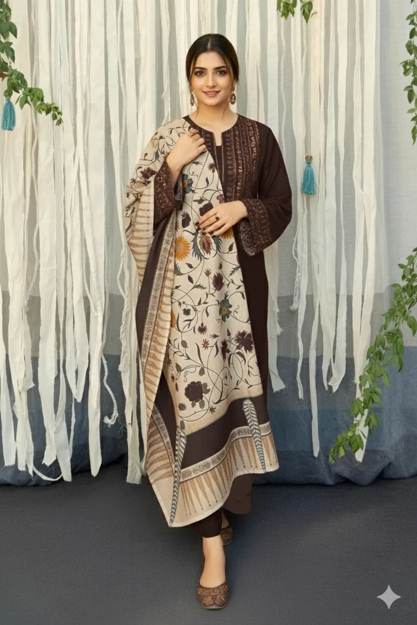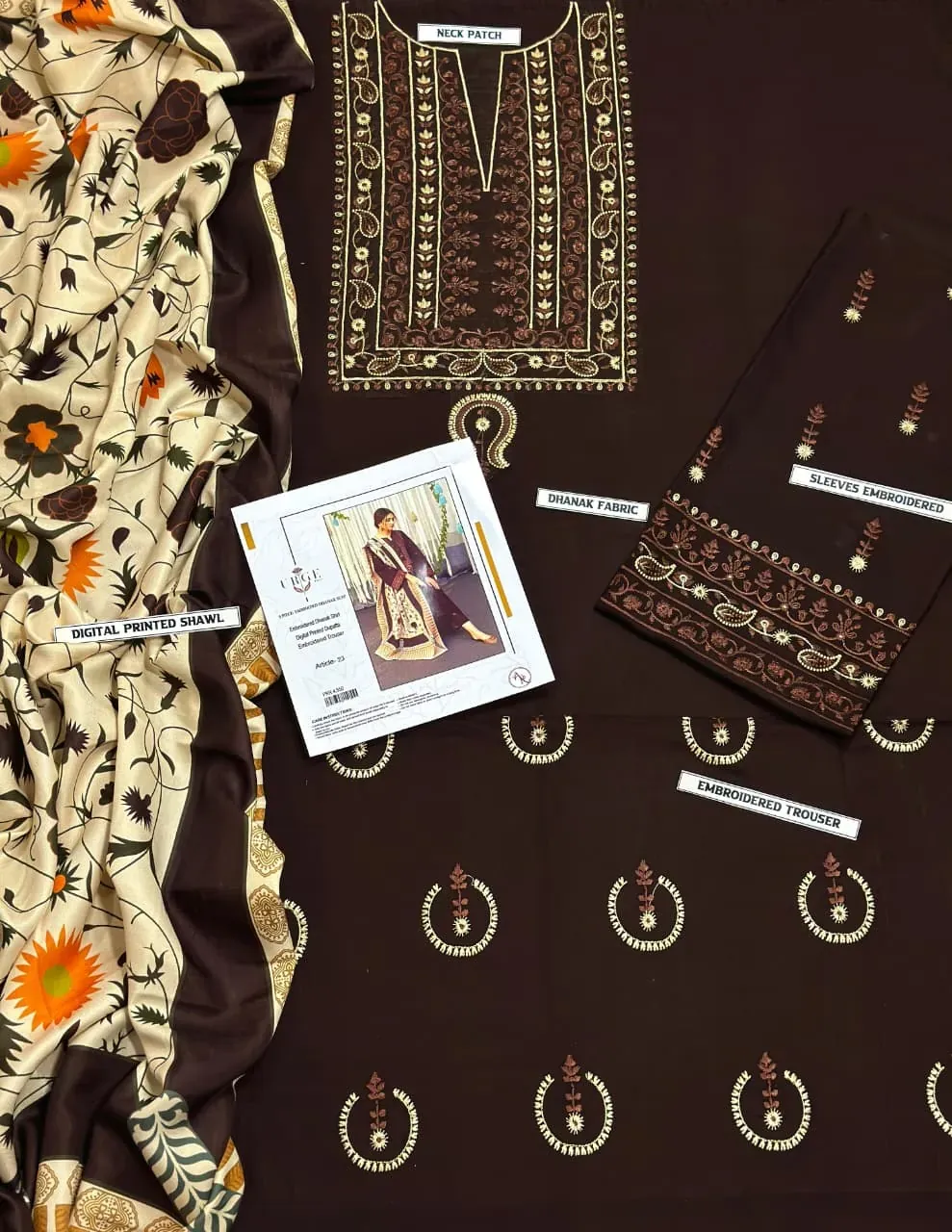 Elevate your winter wardrobe with this exquisite 3PC Dhanak Embroidered suit from URGE's Airjet Dhanak collection. Designed for the discerning woman, this unstitched ensemble blends traditional craftsmanship with contemporary flair, perfect for festive and formal occasions. The front is adorned with intricate heavy embroidery, accentuated by a beautifully crafted embroidered neck patch that adds a sophisticated touch. The sleeves feature elaborate embroidery, enhancing the luxurious flow of the brown dhanak fabric. The back is elegantly plain-dyed for a seamless and comfortable fit. Paired with premium quality embroidered trousers, this set ensures a cohesive and stylish look. The standout piece is the digital printed pashmina shawl, showcasing vibrant floral patterns in warm tones that drape gracefully for both warmth and elegance. Crafted from 100% guaranteed high-quality dhanak fabric (airjet variant), this suit offers durability, softness, and a premium feel. Ideal for the winter season, it combines timeless design with modern elegance, making it a perfect addition to any collection.