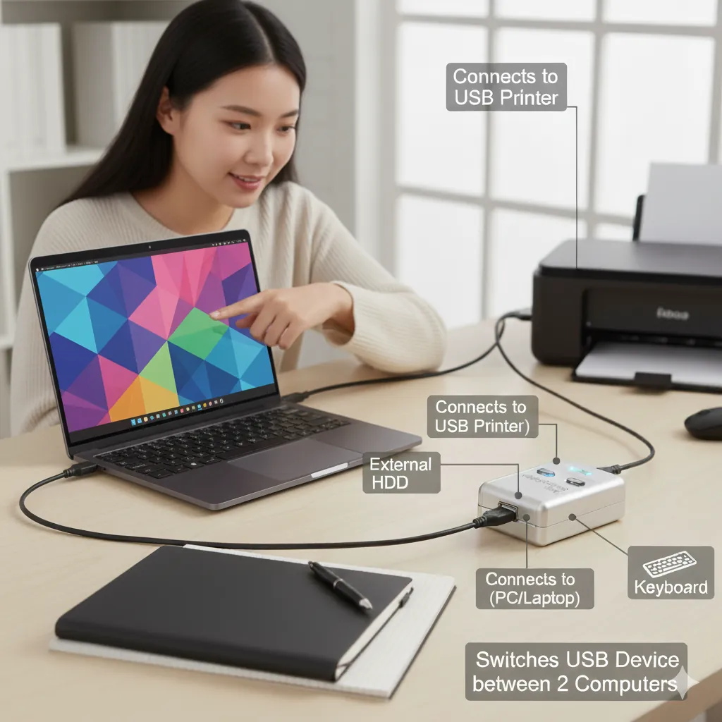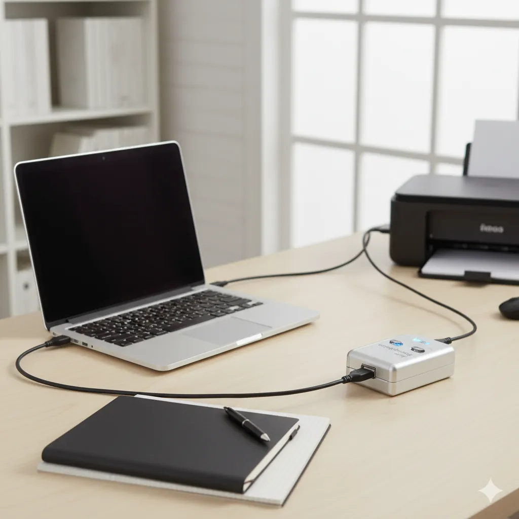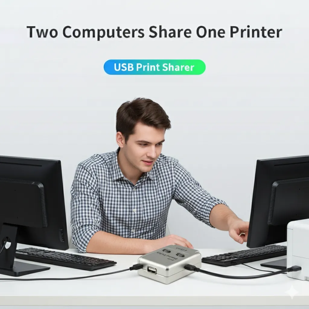 Optimize your workspace with this 2-Port USB 2.0 Auto Data Switch, the perfect solution for easily sharing a single USB device between two computers. Ideal for offices and homes, this compact sharing hub eliminates the hassle of constantly swapping cables or needing a network setup.This intelligent switch features automatic switching, meaning it detects which computer is sending a print job and instantly grants control to that PC. This saves you valuable time and boosts productivity by removing the need for any manual toggling. Plus, its USB-powered design means no external power adapter is necessary, keeping your desk clutter-free.Beyond just printers, this versatile device is compatible with any USB 2.0 peripheral, including scanners, external hard drives, and flash drives. Its Plug & Play functionality ensures an effortless setup—just connect the cables to your devices and it's ready to go without needing complex driver installations. The switch offers fast data transfer up to 480Mbps, and clear LED indicators let you know which computer is active at a glance.