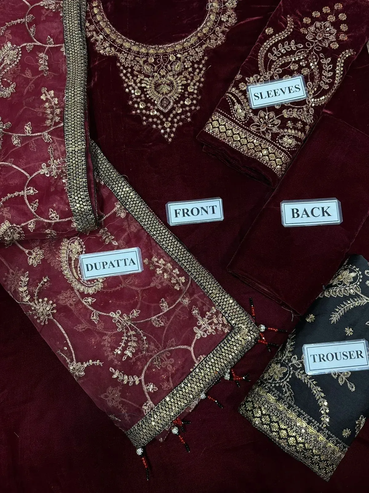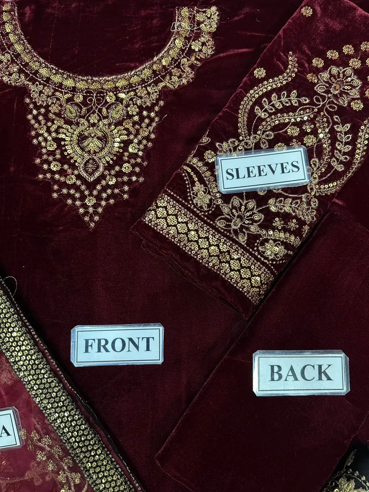 Velvet Embroidered JAZMIN Replica: Ready-to-Wear Formal Suit with Sequin Work, Tassels, and Four-Sided Embroidered Organza Dupatta