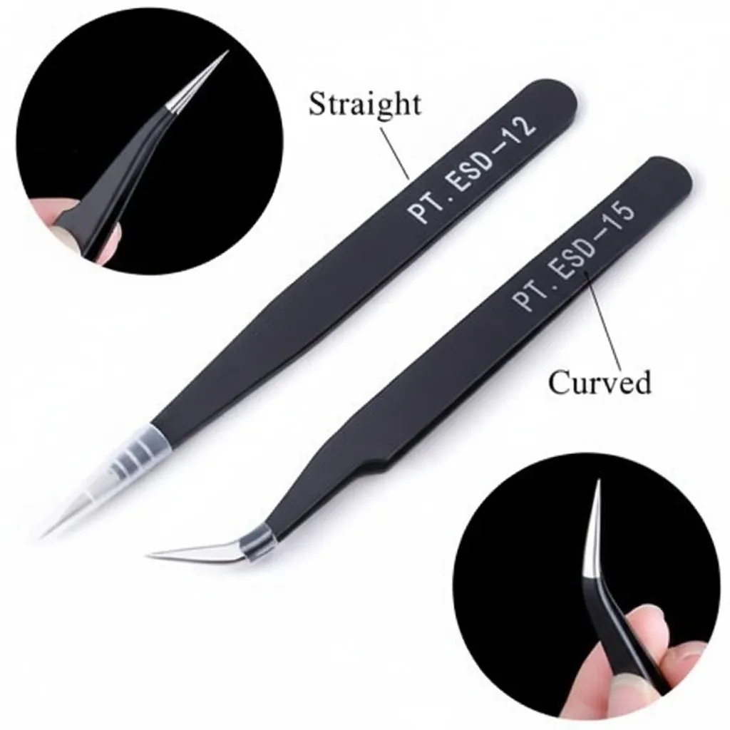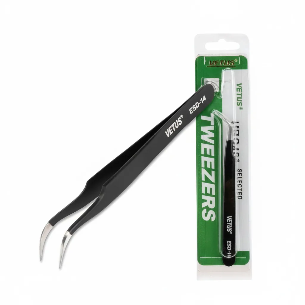 VETUS ESD-14 Anti-Static Curved Fine Tip Tweezers | Stainless Steel Precision Tool for SMD Rework, Electronics Repair & Eyelash Extensions