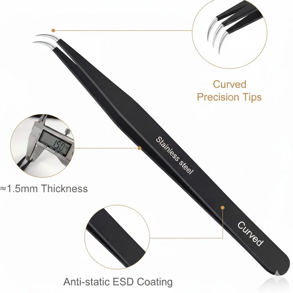 The model shown features a curved, fine tip, providing superior visibility and angled access when working in tight, restricted areas or for picking up tiny components with maximum control. At approximately in length, their lightweight and ergonomic design prevents hand fatigue during prolonged use, catering to professionals in electronics, watchmaking, jewelry crafting, and high-precision applications like eyelash extension artistry.