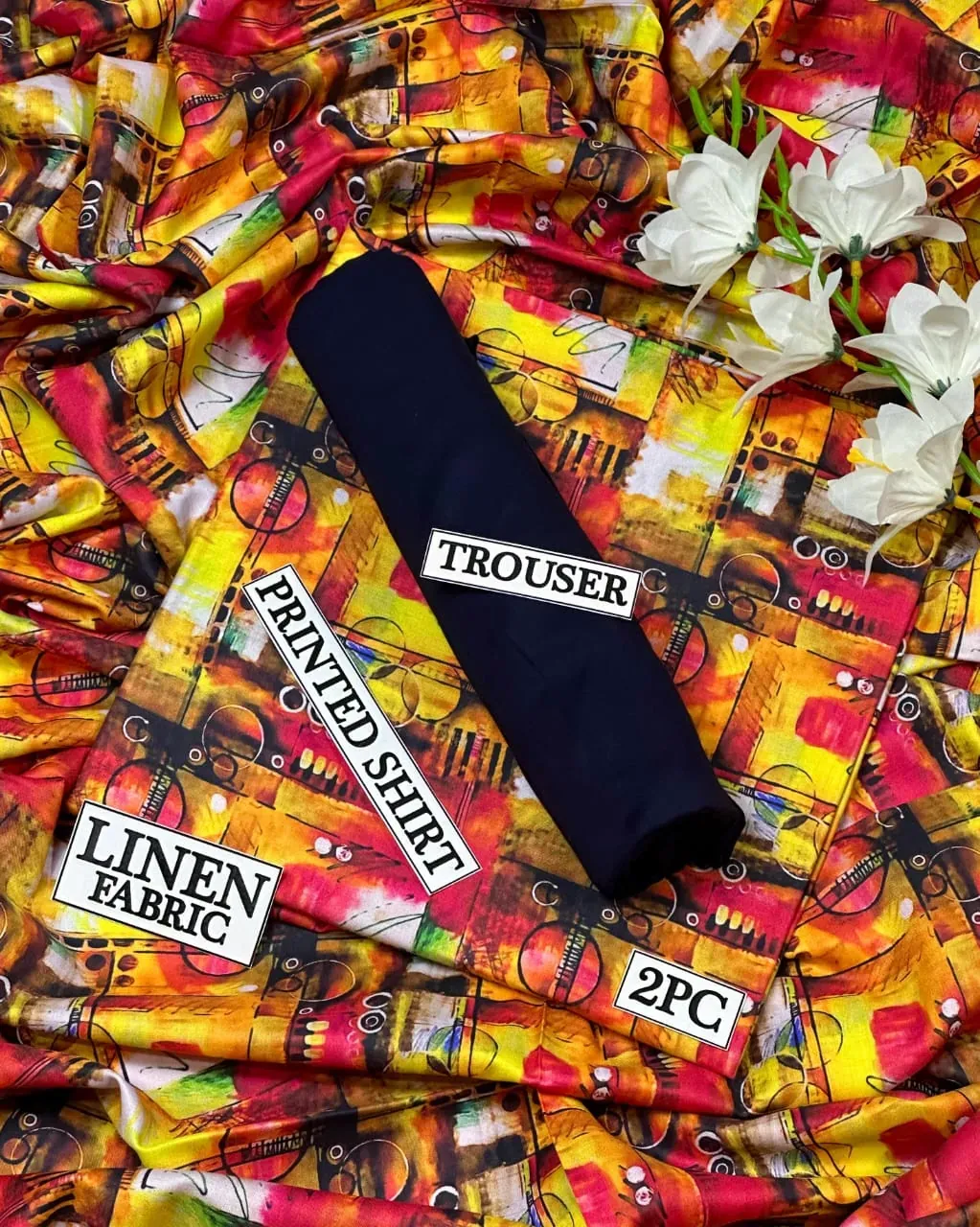 Elevate your wardrobe with this exquisite 2-piece unstitched linen suit. The set comprises a high-quality linen fabric for the shirt, adorned with a bold and colorful abstract print that adds a touch of artistic flair. The fabric is lightweight, breathable, and perfect for all-day comfort. The suit also includes a matching solid-colored trouser fabric, allowing you to create a harmonious and fashionable ensemble. Whether you're dressing up for a casual outing or a festive occasion, this versatile suit offers endless styling possibilities. The durable and easy-to-care-for linen material ensures long-lasting wear and a luxurious feel.
