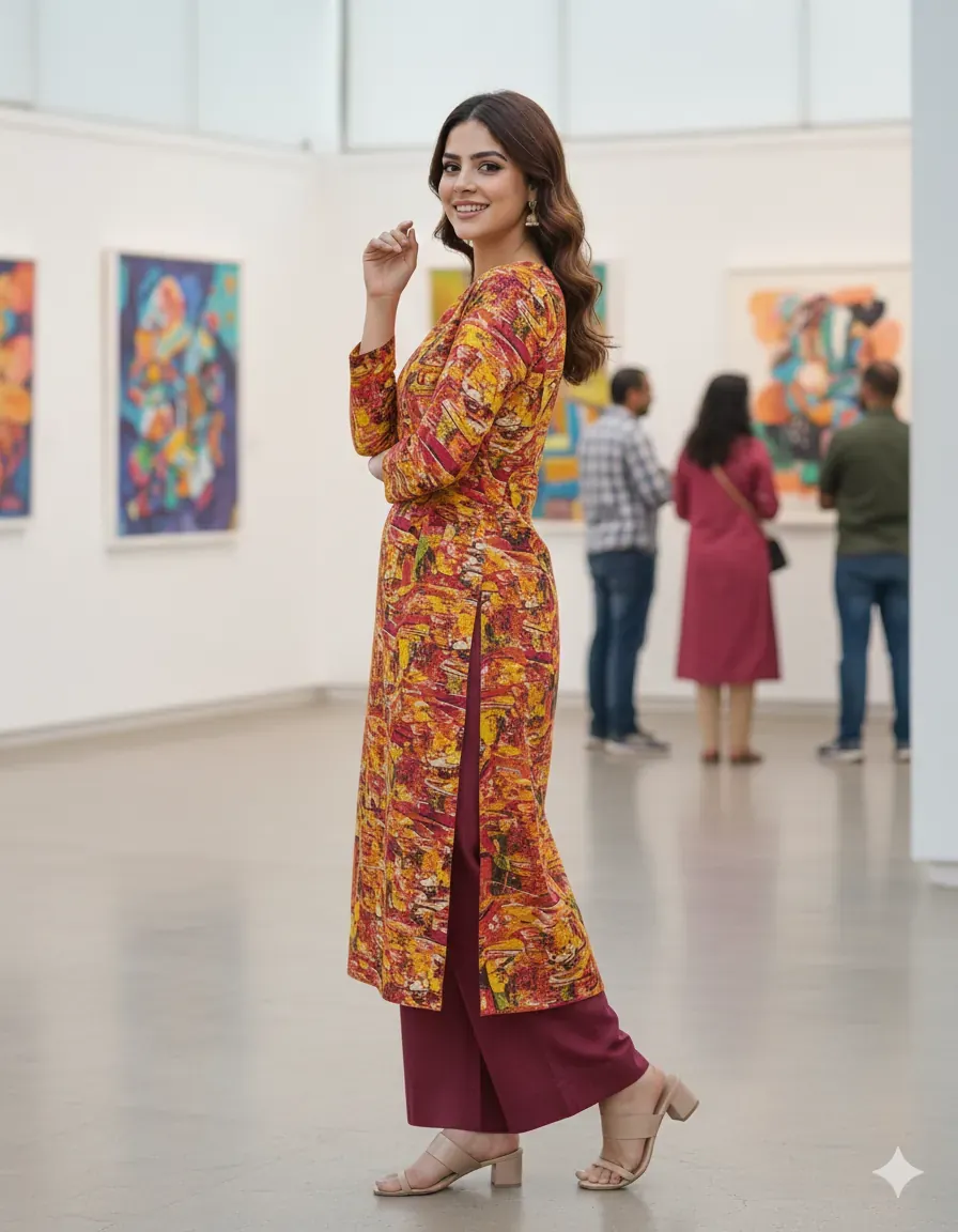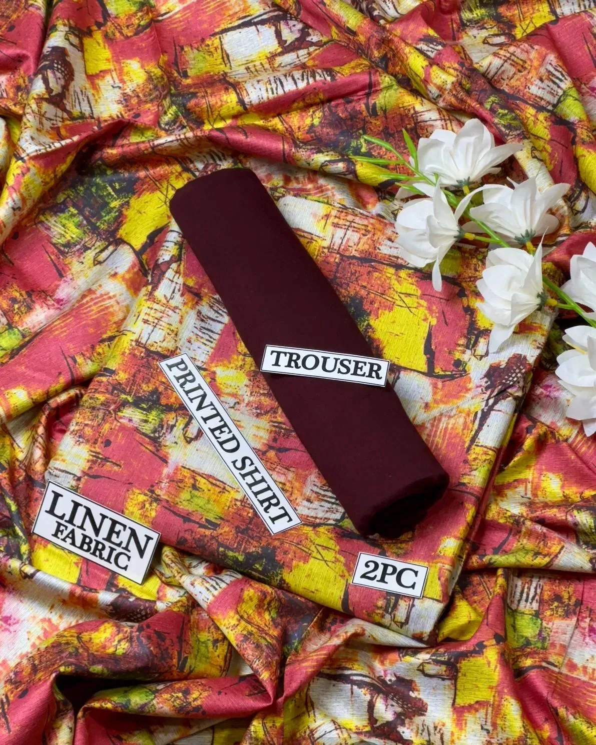 Vibrant Abstract Printed Linen Shirt with Plain Maroon Trousers - 2PC Unstitched Suit