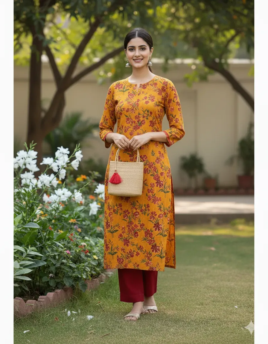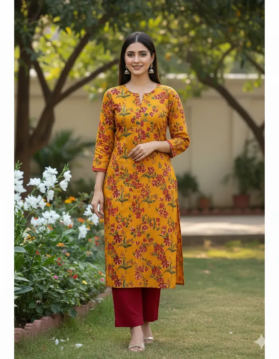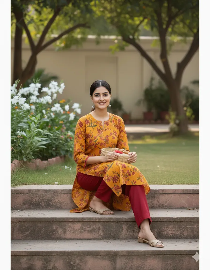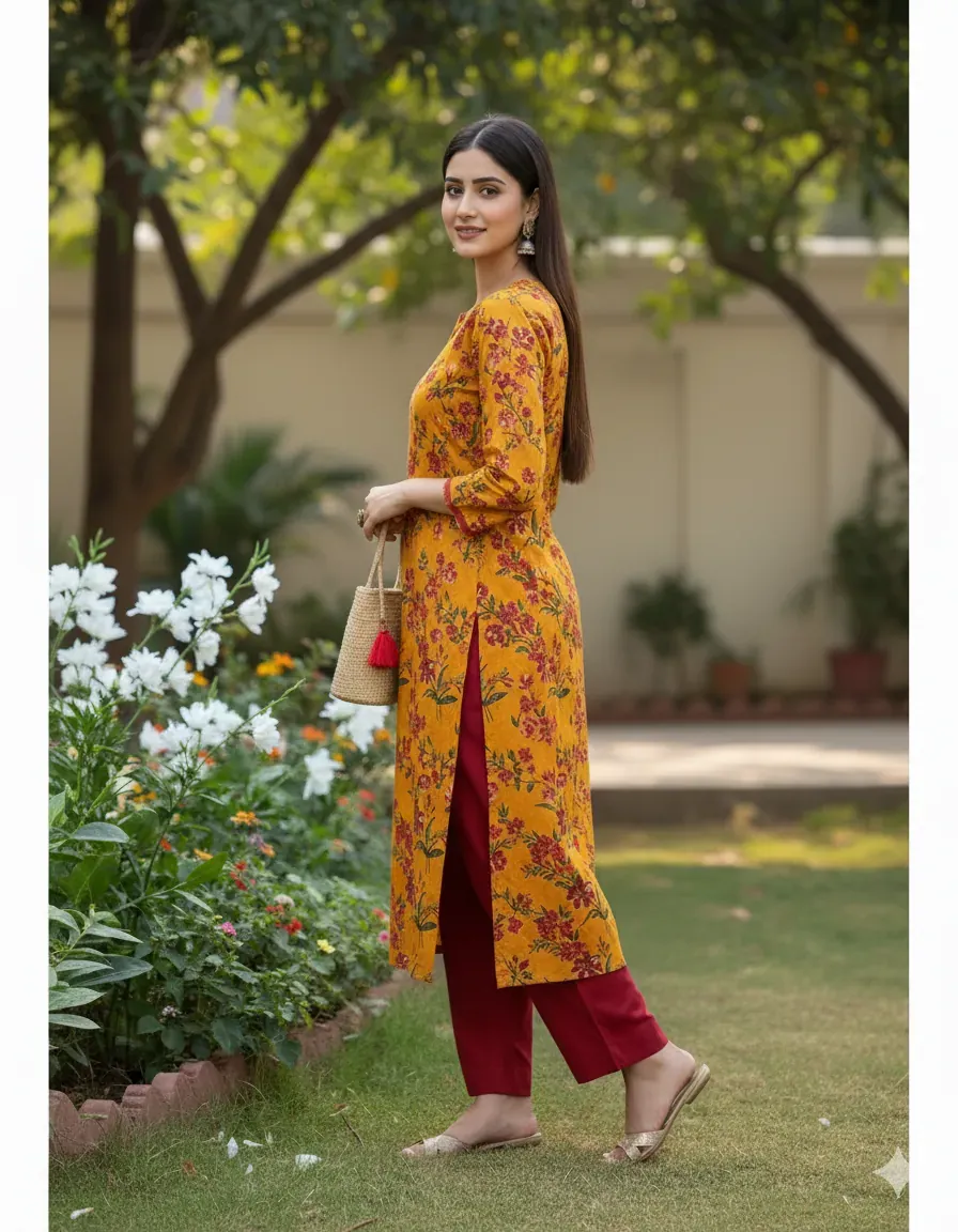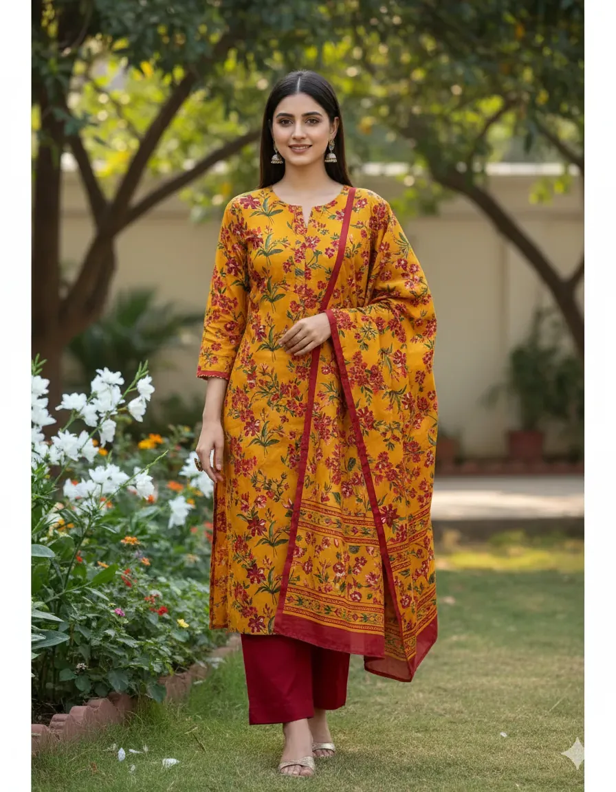 Discover the perfect blend of style and comfort with this stunning 2-piece linen suit. The set features a vibrant yellow shirt fabric adorned with a beautiful floral print in shades of red and green, offering a lively and fashionable appeal. Paired with a solid-colored red trouser fabric, this suit provides a harmonious and complete ensemble. Made from high-quality linen, the fabric is lightweight, breathable, and ideal for all-day wear. This ready-to-stitch dress material allows you to customize the fit and design to your liking, making it a versatile addition to your wardrobe. Perfect for casual outings, office wear, or festive occasions, this suit is a must-have for every fashion-conscious woman.