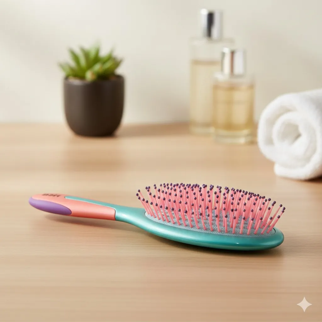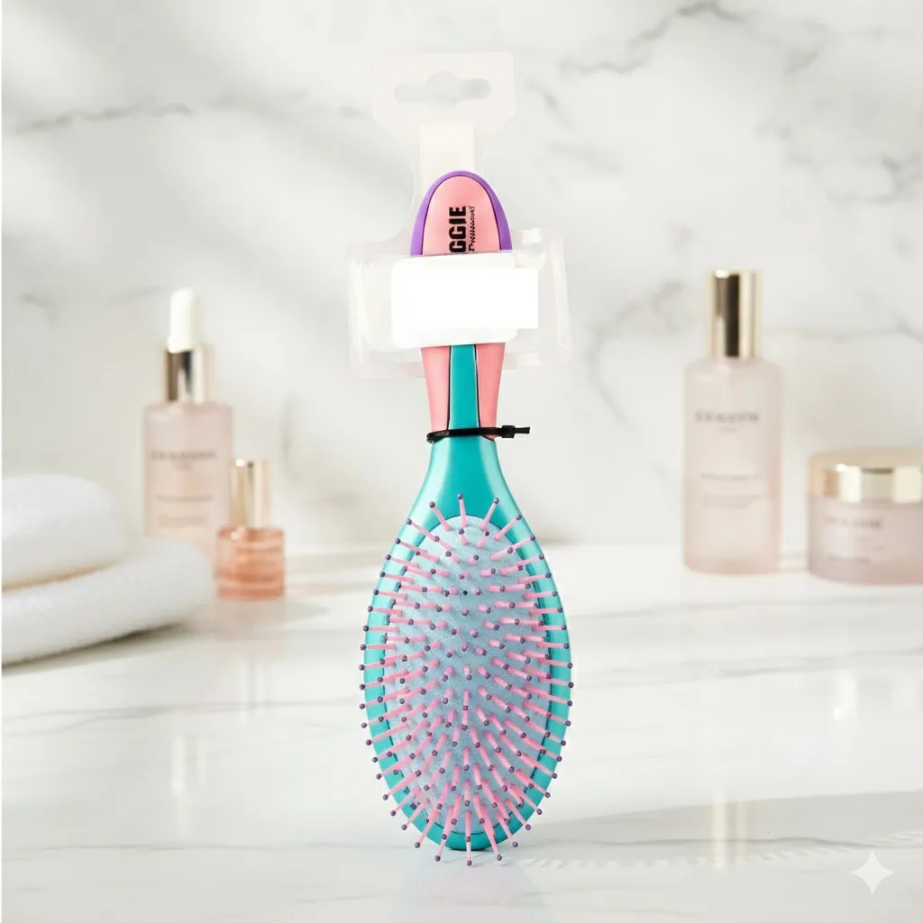 Upgrade your hair care game with the ultimate fusion of style and functionality. This Professional Cushioned Paddle Brush is meticulously designed to handle the toughest tangles without the tugging or breakage associated with traditional brushes.The vibrant teal body, rose-pink cushion, and purple-tipped bristles don’t just look great on your vanity; they work in harmony to smooth the hair cuticle and enhance natural shine. Whether you have thick, curly locks or fine, straight strands, the flexible bristles adapt to your scalp's contours, ensuring a gentle experience from root to tip. Perfect for post-shower detangling or a quick mid-day refresh, this brush is your go-to for frizz-free, salon-quality results at home.