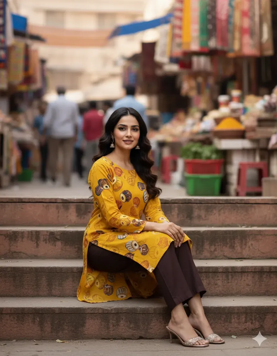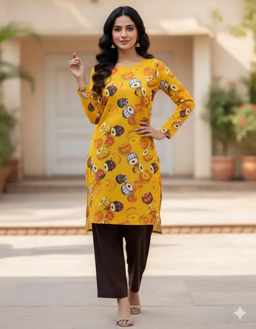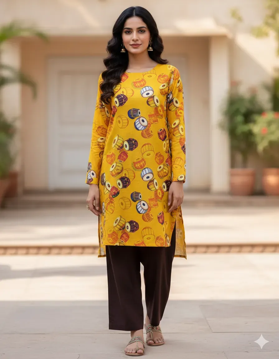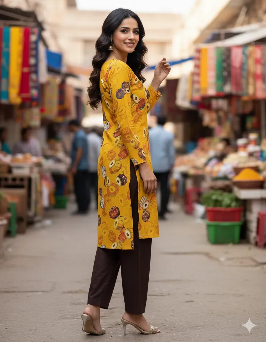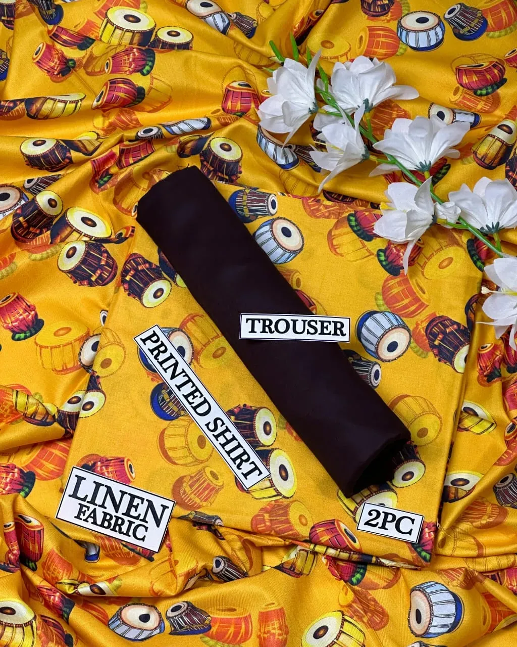 Step out in unique style with our Vibrant Yellow Dholak Print Linen 2-Piece Suit. This eye-catching unstitched suit set is made from premium linen fabric, offering exceptional comfort and breathability perfect for casual wear, festive occasions, or cultural events during the summer and spring. The shirt boasts a lively yellow base adorned with an all-over print of traditional Indian dholak drums, creating a distinctive and cheerful aesthetic. It is perfectly complemented by a solid dark brown trouser piece, allowing for a balanced and stylish ensemble. This versatile linen suit ensures you stand out with its cultural charm and comfortable feel.
