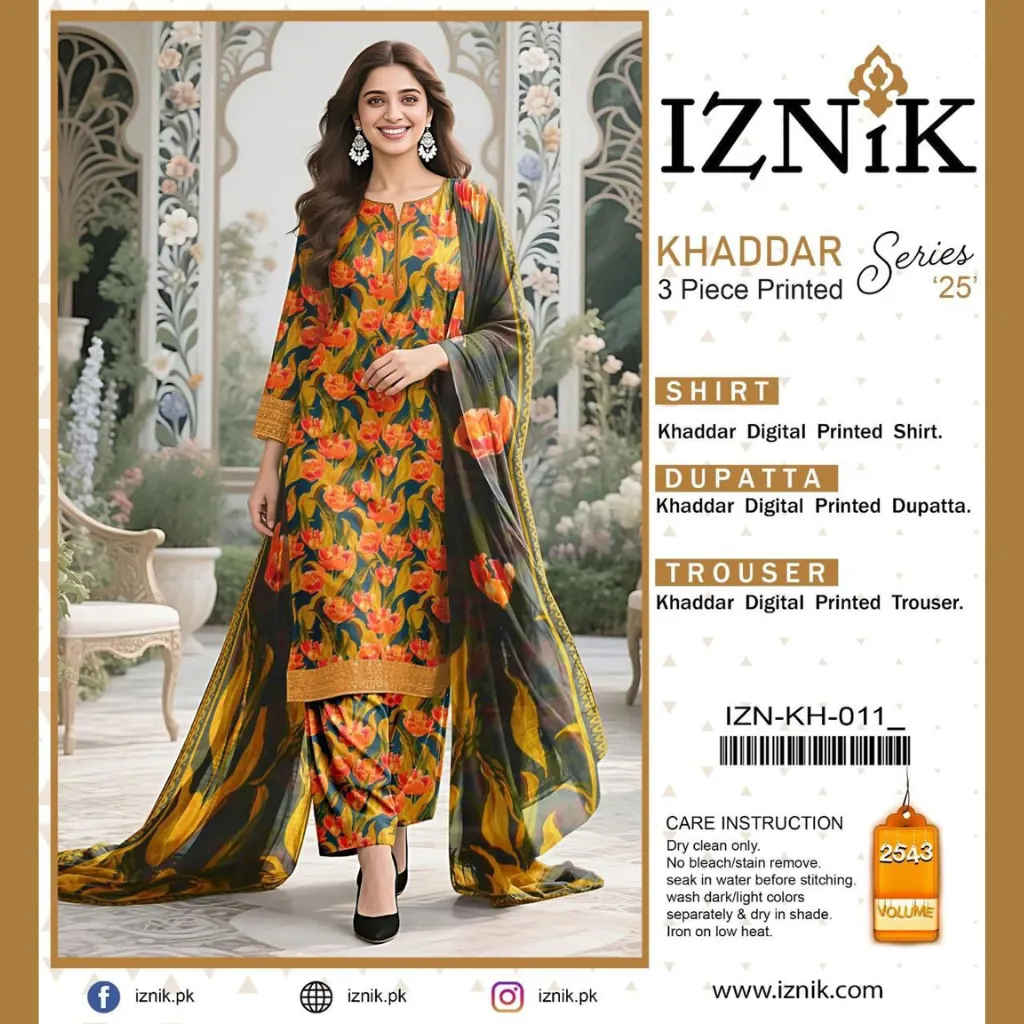 Elevate your winter wardrobe with Iznik’s Khaddar Printed Unstitched 3 Piece Collection. Crafted with premium quality khaddar, this ensemble blends warmth, comfort, and timeless elegance. Featuring a beautifully printed shirt, matching trouser, and coordinating dupatta, it is the perfect choice for everyday wear and seasonal gatherings. Designed for the modern woman who values both style and practicality.