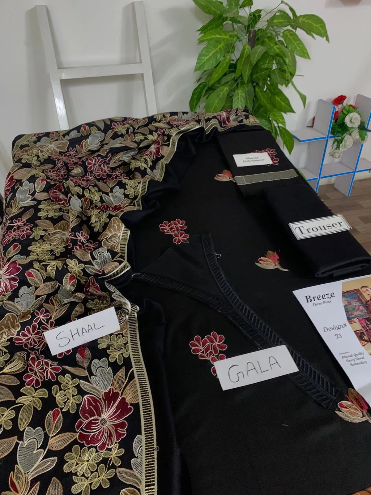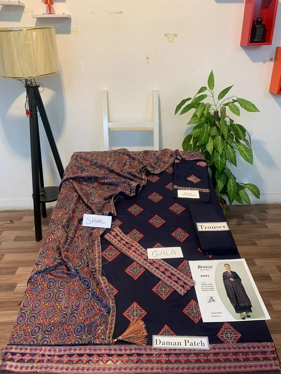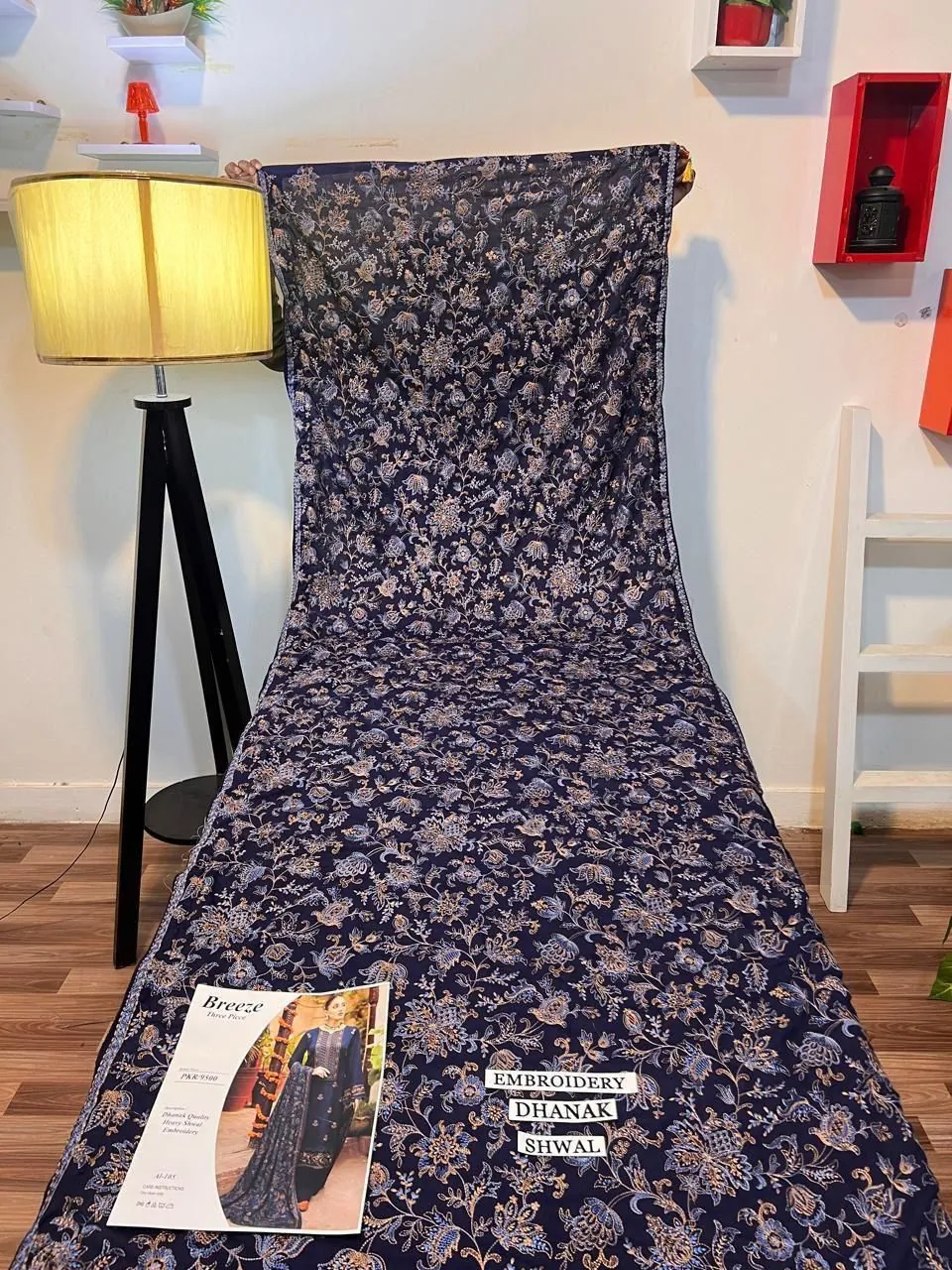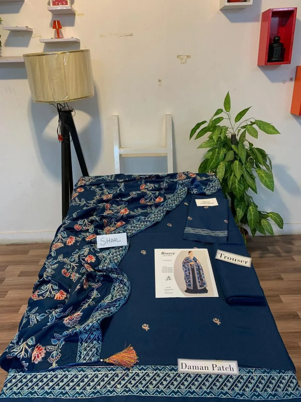 This exquisite unstitched 3-piece suit features a heavily embroidered Dhanak shirt with neck patches and detailed sleeves embroidery, ensuring a graceful and trendy winter look. The embroidered shawl adds a luxurious touch with its heavy design, while the plain trouser completes the outfit for a balanced, classy appearance.