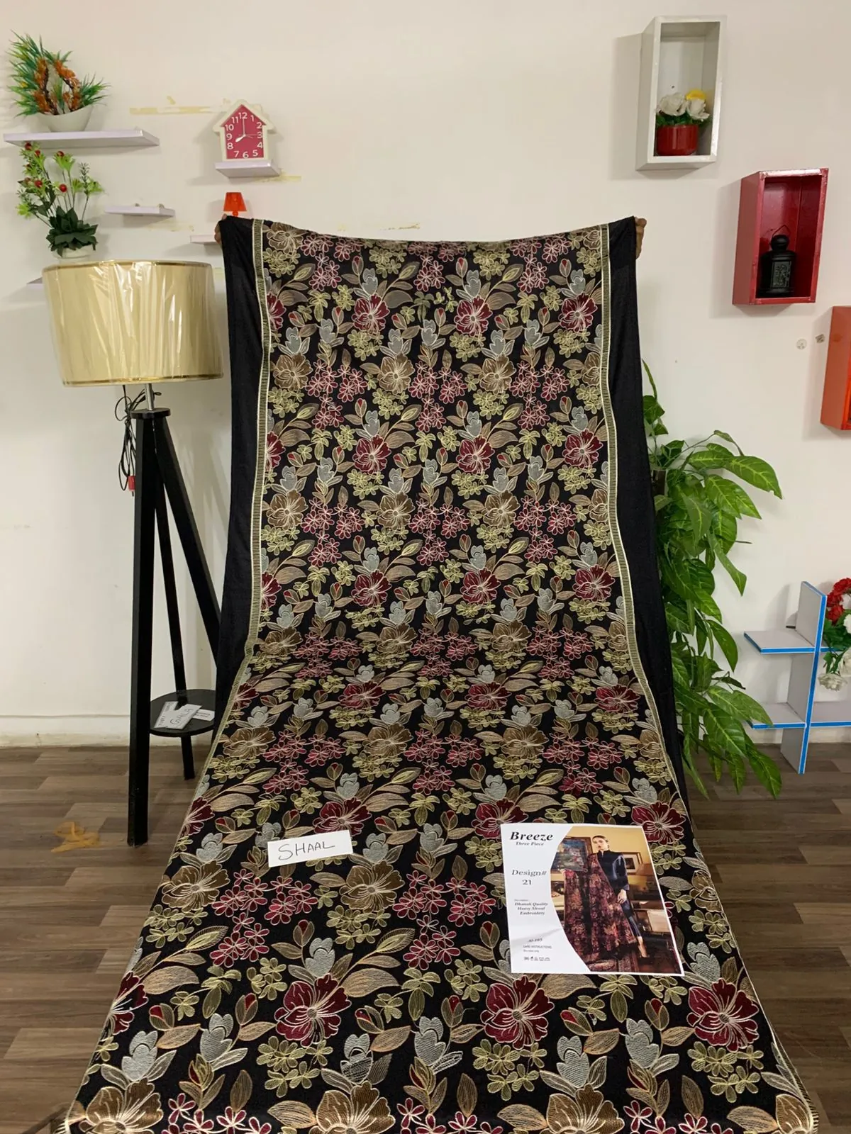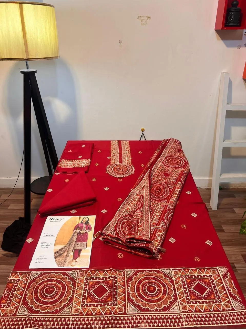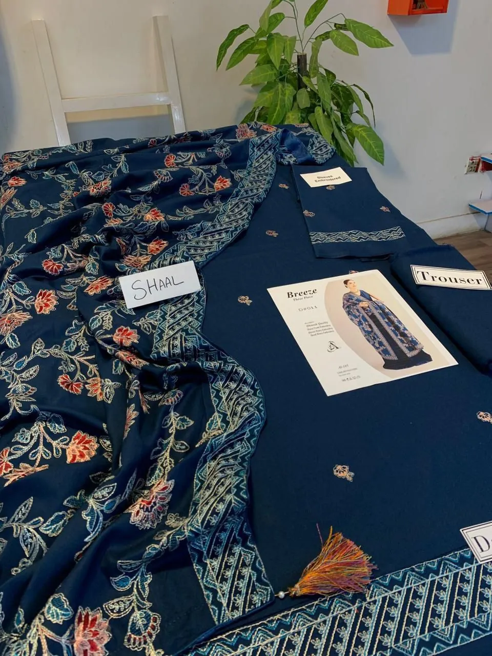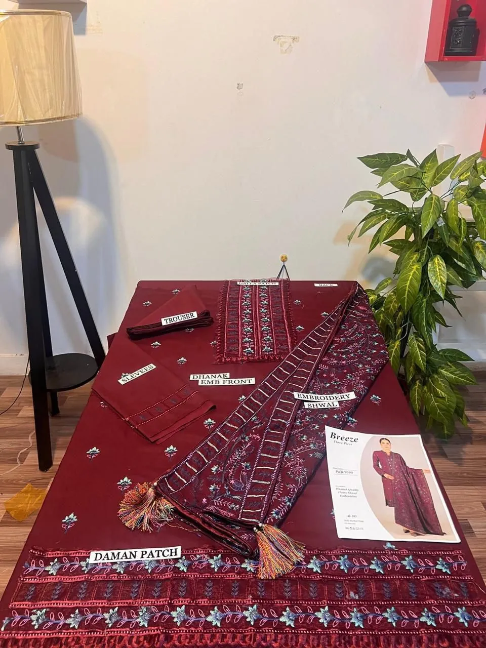 This exquisite unstitched 3-piece suit features a heavily embroidered Dhanak shirt with neck patches and detailed sleeves embroidery, ensuring a graceful and trendy winter look. The embroidered shawl adds a luxurious touch with its heavy design, while the plain trouser completes the outfit for a balanced, classy appearance.