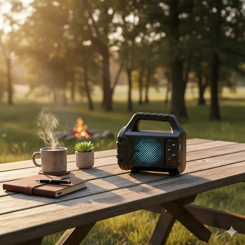 With Bluetooth connectivity, full-band FM radio, and a durable portable design with hanging rope, this all-in-one device is ideal for camping, travel, outdoor gatherings, and home use.