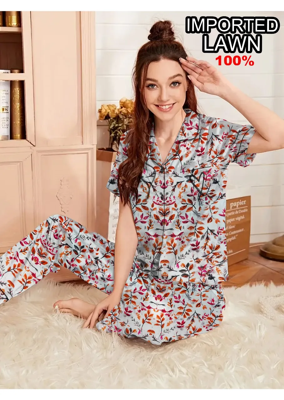 Women’s 2-Piece Night Suit – 100% Imported Lawn Fabric – White Leaf Print Pajama Set – Soft Breathable Summer Sleepwear for Ladies
