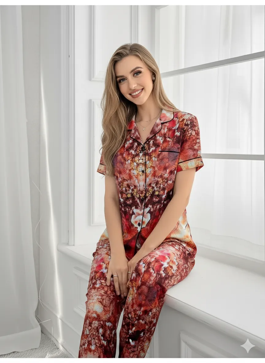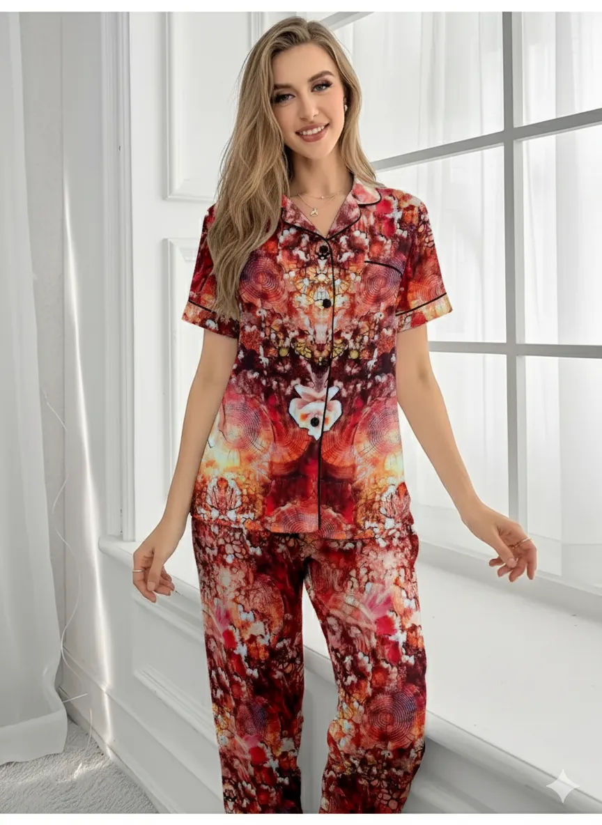 The set includes a short-sleeve, button-down top with a classic collar and contrast piping, paired with relaxed-fit straight pants that offer a breezy, lightweight feel—perfect for summer nights or lounging around in style. The vibrant color palette and high-quality fabric make this sleepwear set a standout in any wardrobe.