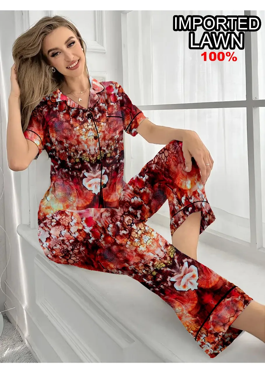 Turn bedtime into a bold fashion statement with our Women’s 2-Piece Night Suit Set, crafted from 100% imported lawn fabric for unmatched comfort and breathability. Featuring a striking abstract floral print in rich tones of red, burnt orange, chocolate brown, and peach, this nightwear brings both elegance and artistic flair to your nighttime routine.