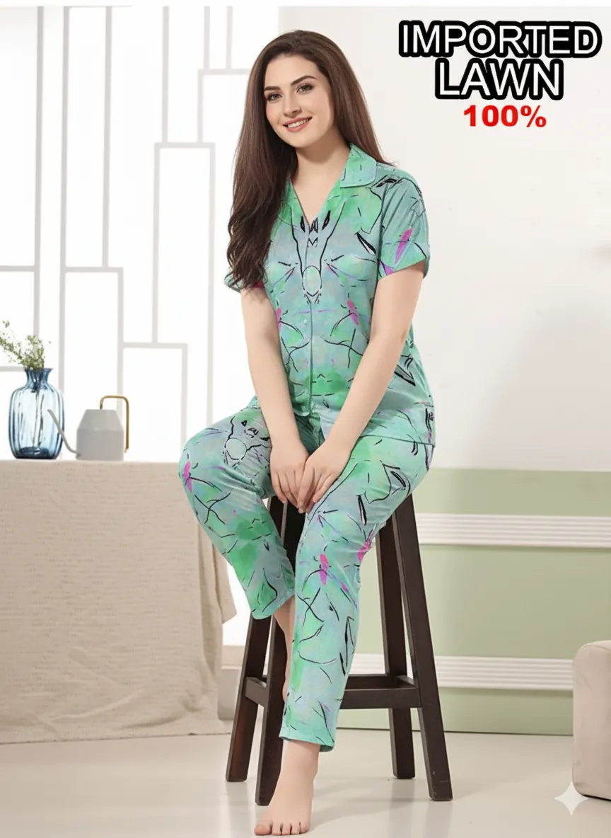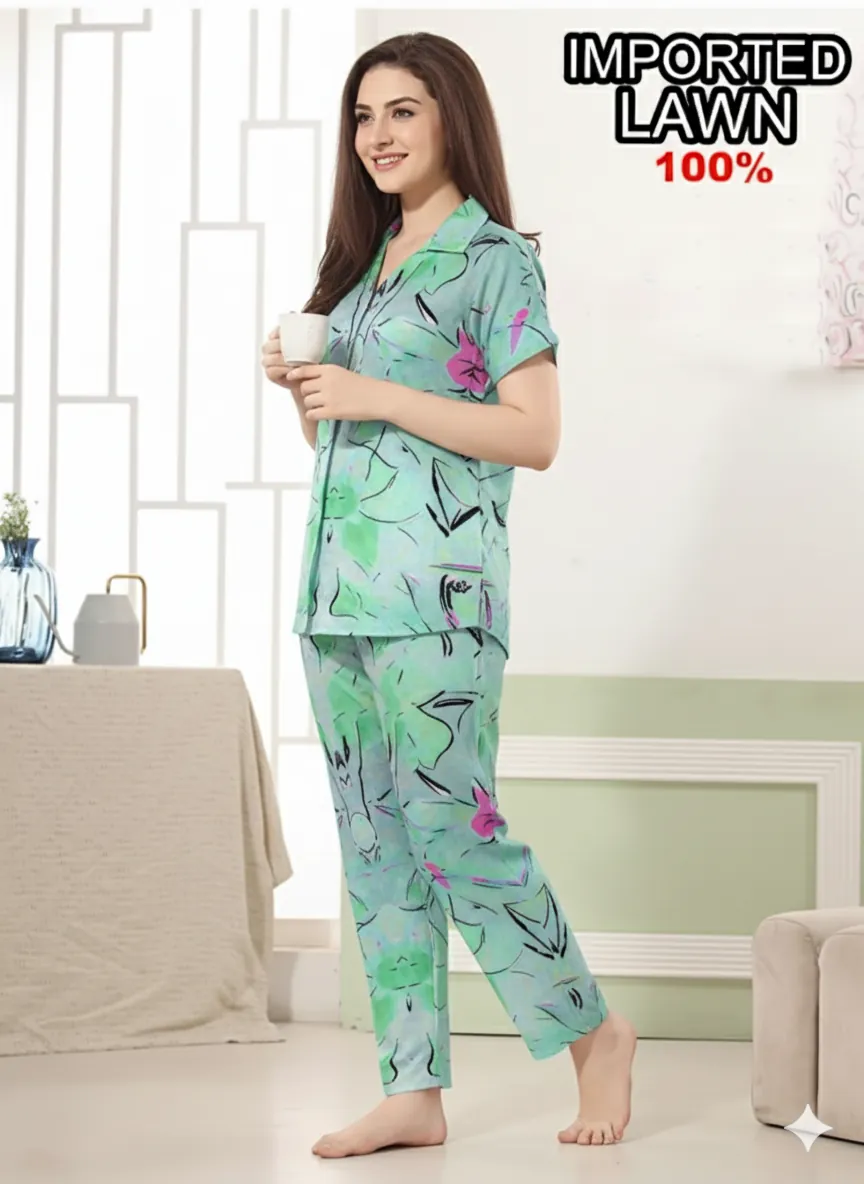 Women’s 2-Piece Night Suit Set in Imported Lawn – Stylish Green & Pink Floral Summer Sleepwear | Soft & Breathable Fabric