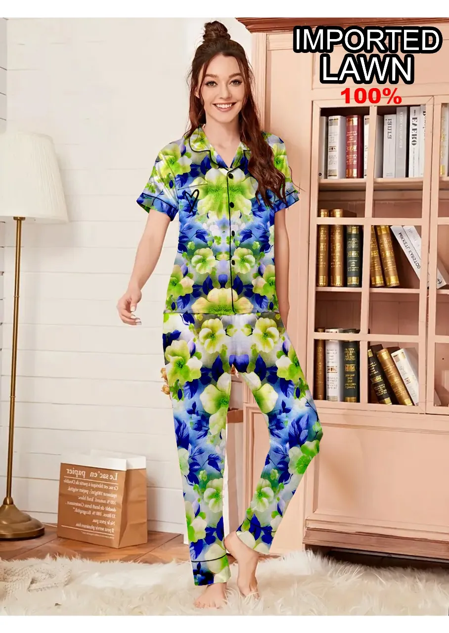 Step into a garden of dreams with this Blue & Green Floral Night Suit made from 100% premium imported lawn. This 2-piece pajama set features a vivid floral print in bold shades of blue, green, and yellow — making bedtime more stylish than ever.