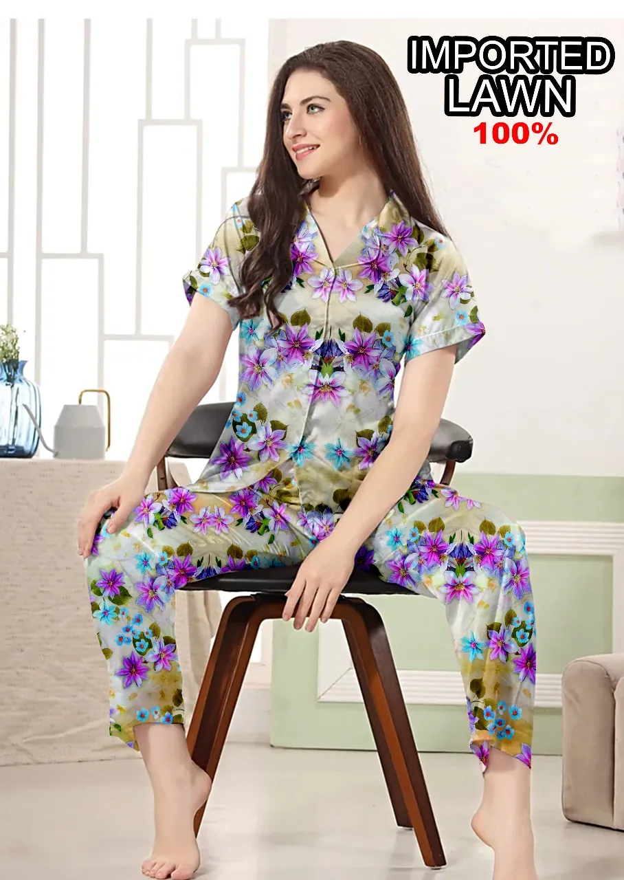 Bring elegance to your nights with this Light Beige Floral Night Suit, crafted from 100% imported lawn fabric. Featuring a soothing color palette of beige, violet, blue, and green, this pajama set creates a soft and graceful look that’s ideal for unwinding in comfort and style.
