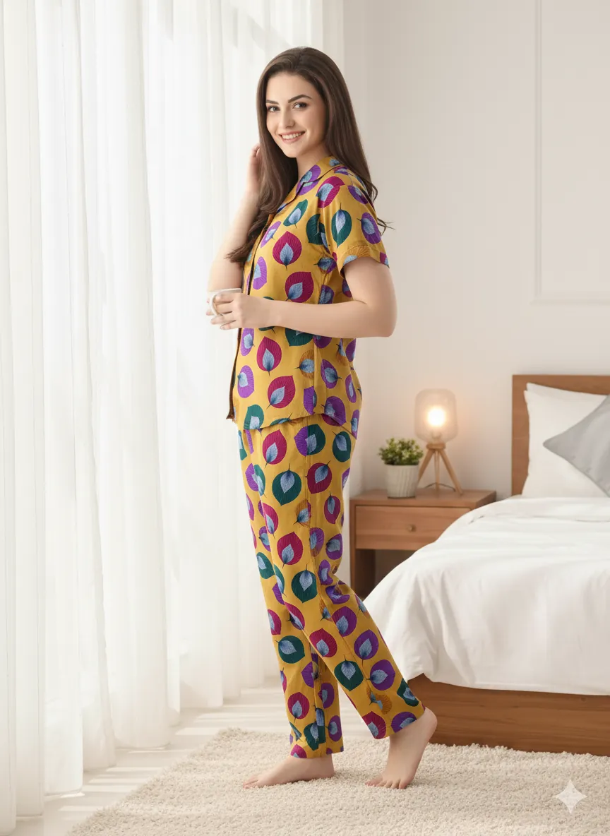This summer nightwear set features a mustard yellow base with a vibrant multicolor leaf print in purple, teal, red, and blue, making it both trendy and eye-catching. The button-down short sleeve shirt is paired with relaxed-fit full-length trousers, offering ease of movement and a flattering silhouette for all body types.