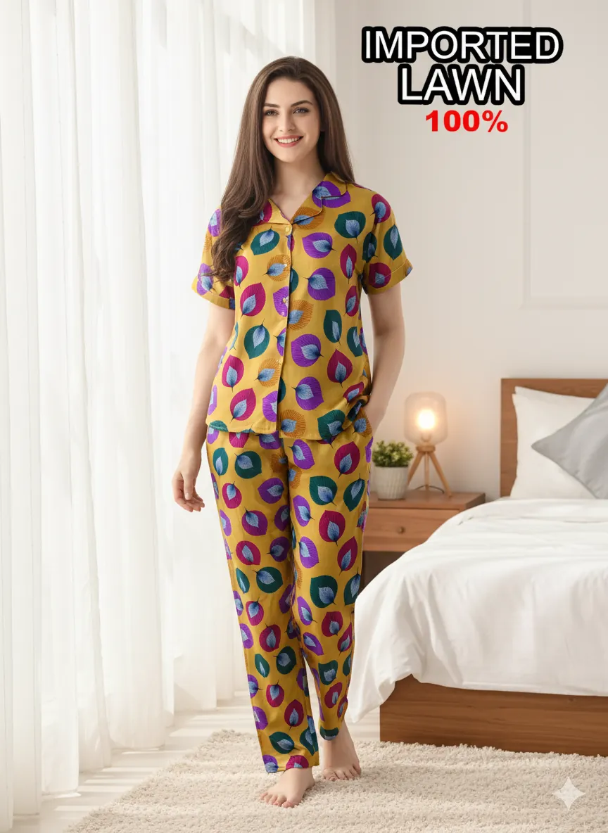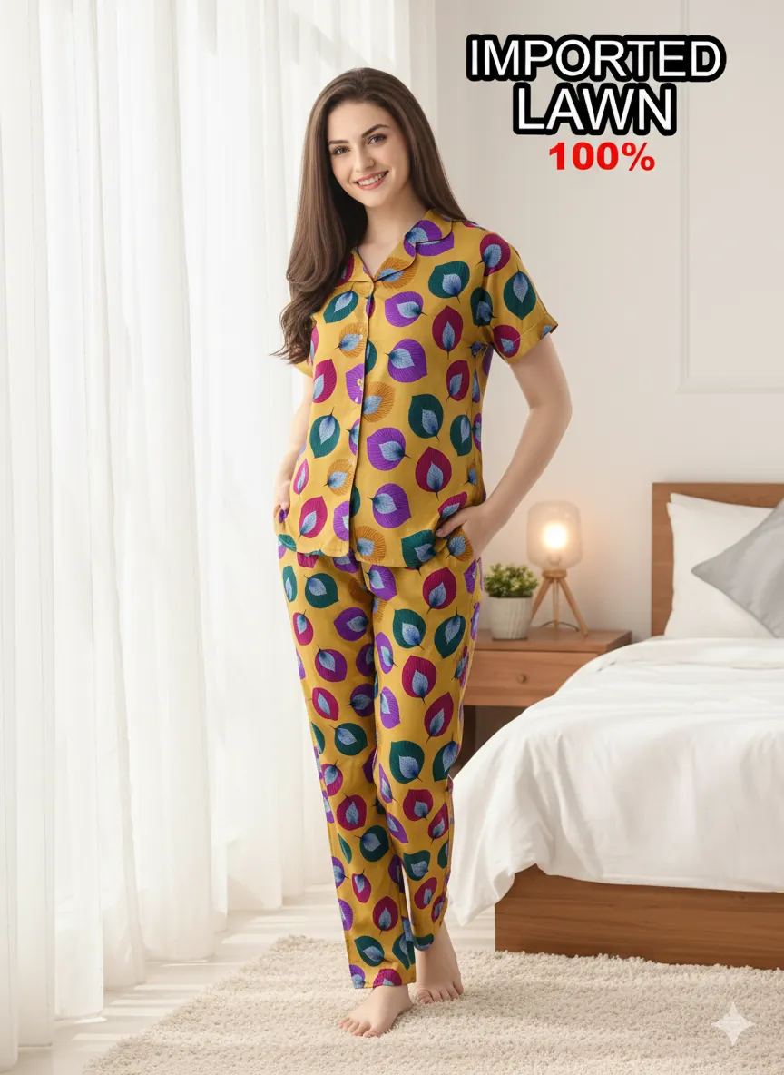 Women’s Night Suit – 100% Imported Lawn Fabric – Summer Pajama Set – Printed 2-Piece Sleepwear – Short Sleeve Top with Trousers – Stylish Leaf Print Loungewear