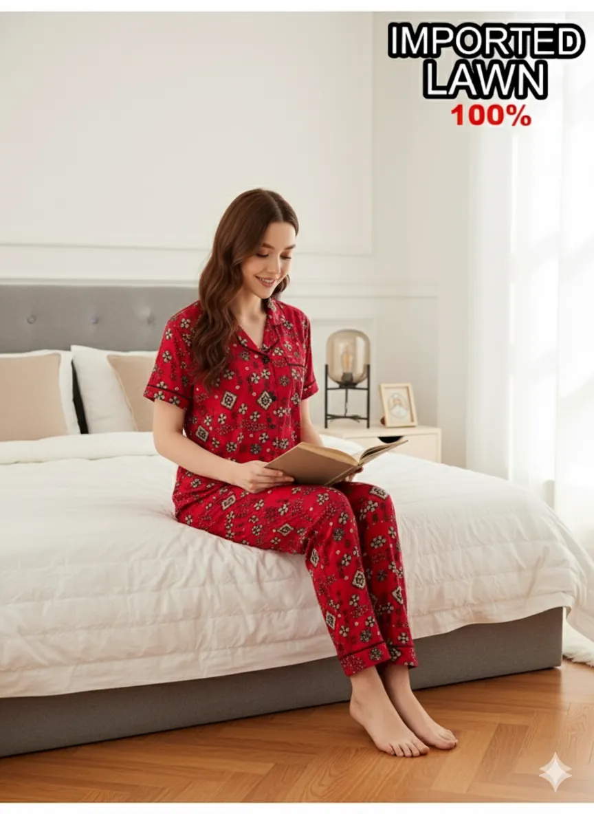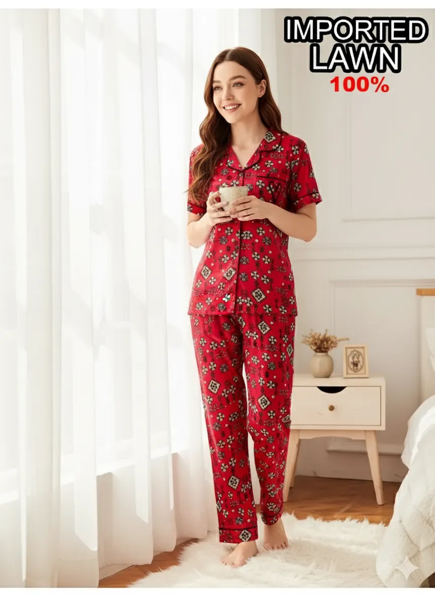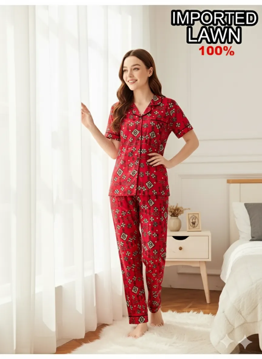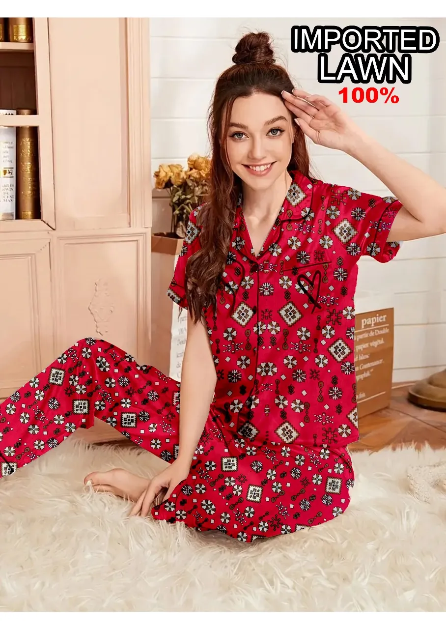 Refresh your nightwear collection with this stylish and breathable 2-piece women’s night suit, crafted from 100% imported lawn fabric. Designed with comfort in mind, this vibrant red night suit features an eye-catching all-over geometric print that adds a playful yet elegant touch to your loungewear