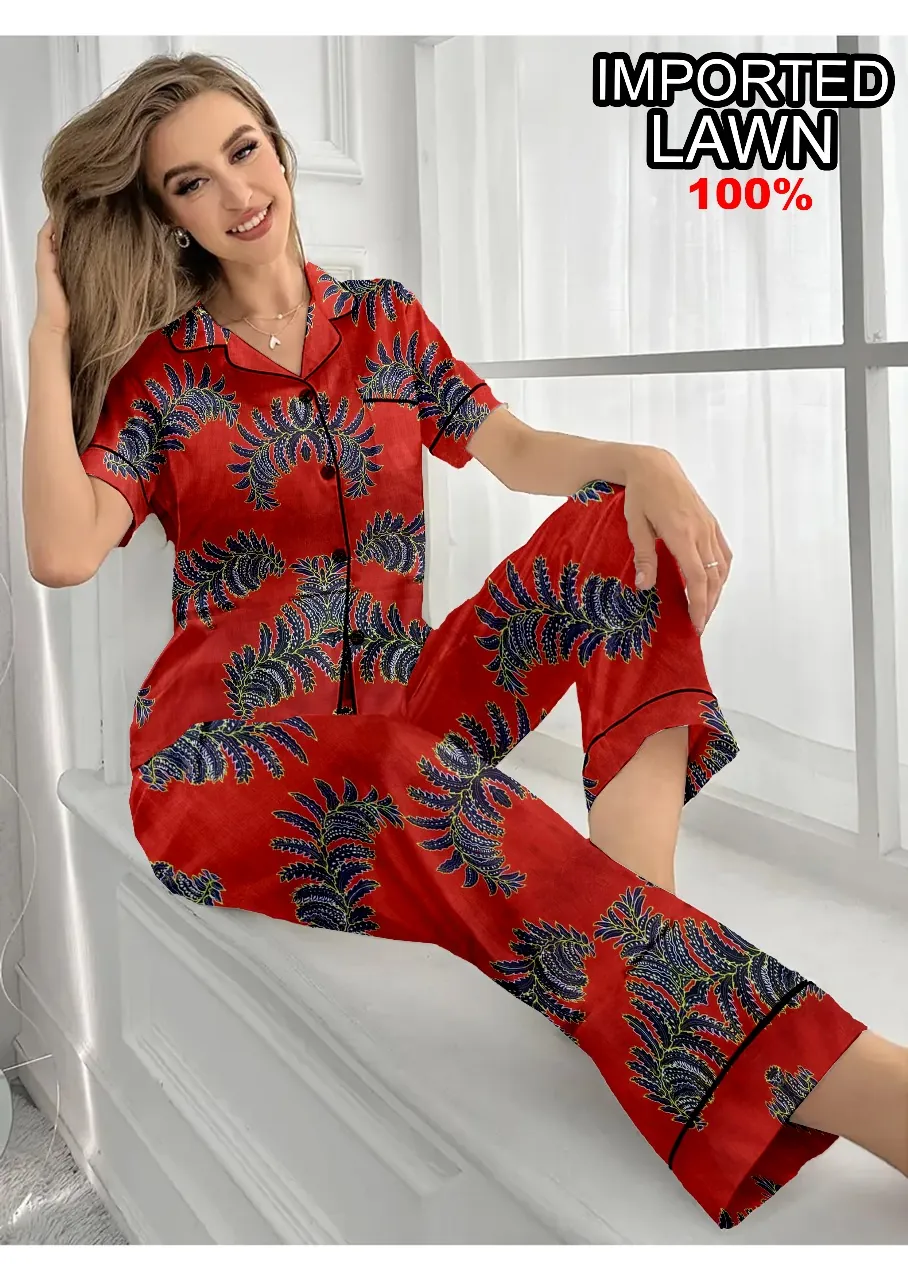 Add bold color and timeless elegance to your nightwear collection with this Women’s 2-Piece Night Suit Set, made from 100% imported lawn fabric. Perfect for summer nights, this set features a rich red base with intricate navy and gold-toned leaf prints, giving it a classy, resort-inspired look