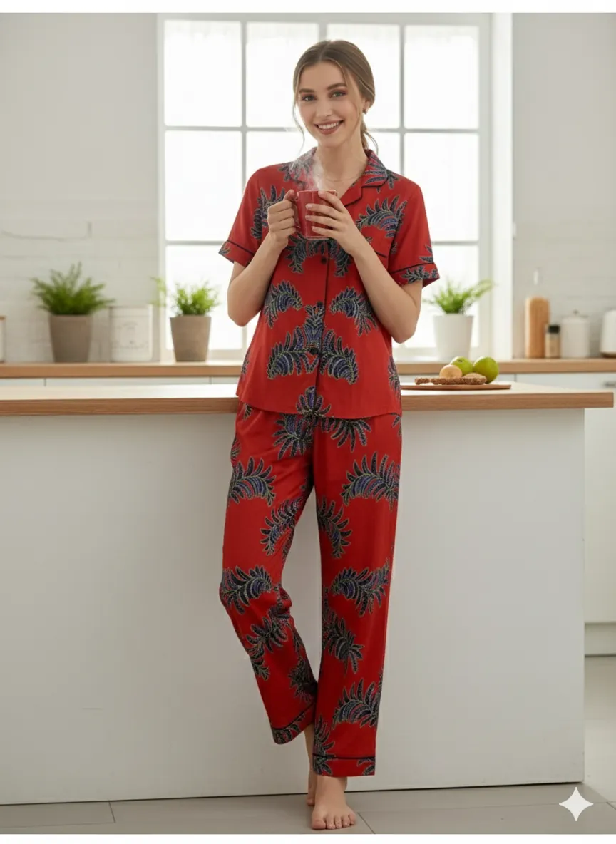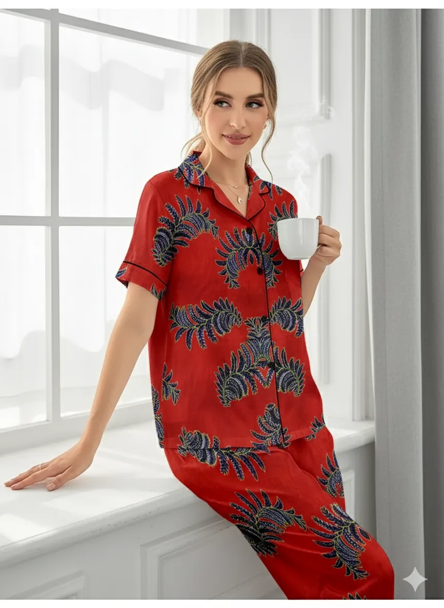 Women’s Red Night Suit Set – 2-Piece Sleepwear in 100% Imported Lawn | Elegant Leaf Print | Summer Lounge Set