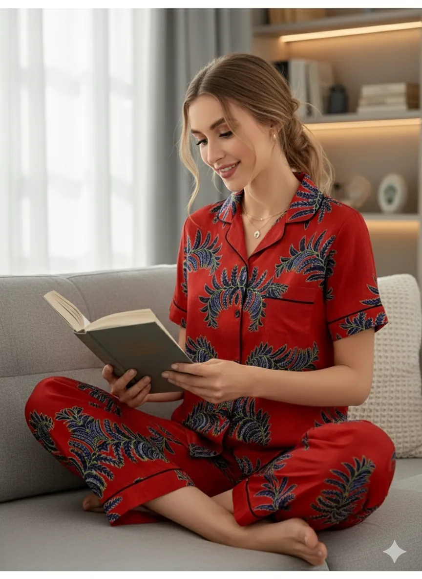 Whether you're winding down after a long day or enjoying a lazy weekend morning, this night suit set combines luxury, comfort, and vibrant style effortlessly.