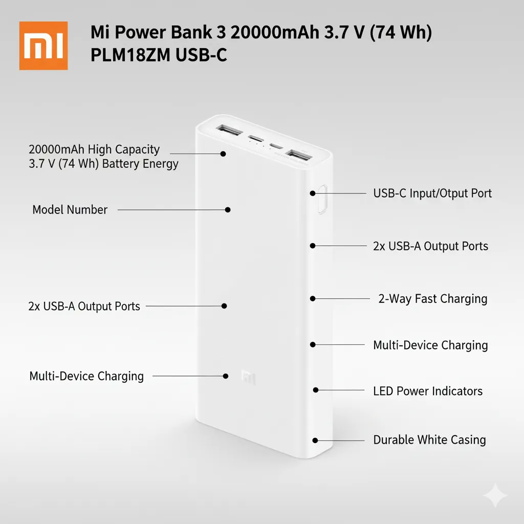 The Xiaomi Mi Power Bank 3 20000mAh (PLM18ZM) delivers powerful, reliable, and efficient charging in a sleek, minimal design.