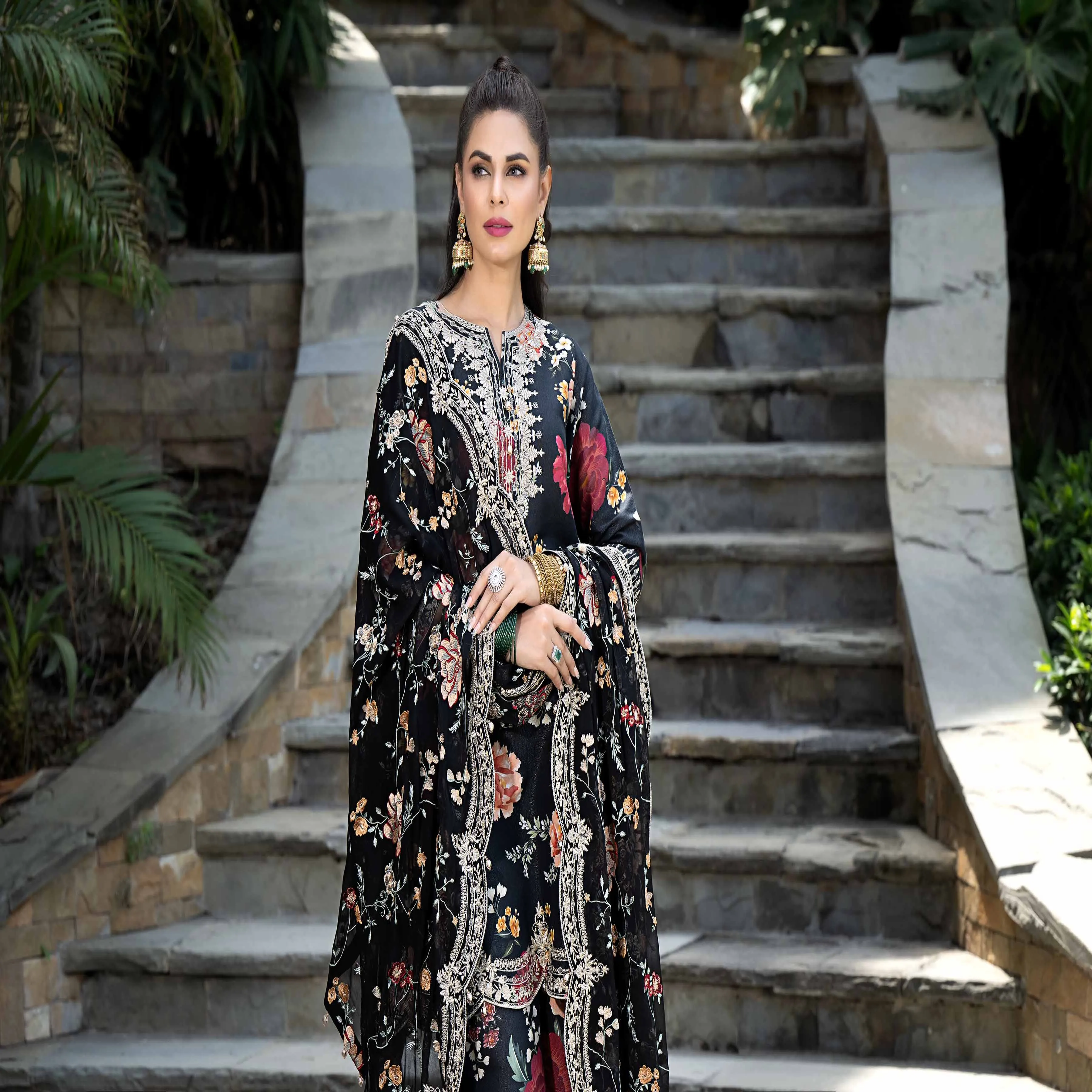 Zainab Chottani 3-Piece Unstitched Suit | Black & Multicolor Floral Print | Velina Fabric. Step into elegance with this stunning 3-piece unstitched Zainab Chottani suit. It features a sophisticated black base with a vibrant all-over floral print in multiple colors. The suit is crafted from premium Velina fabric, offering a luxurious feel and a beautiful drape.