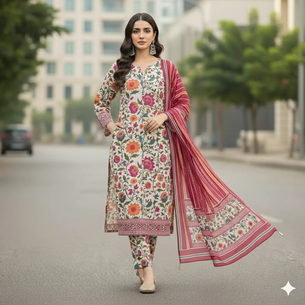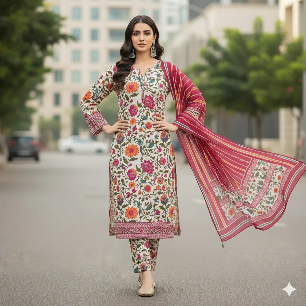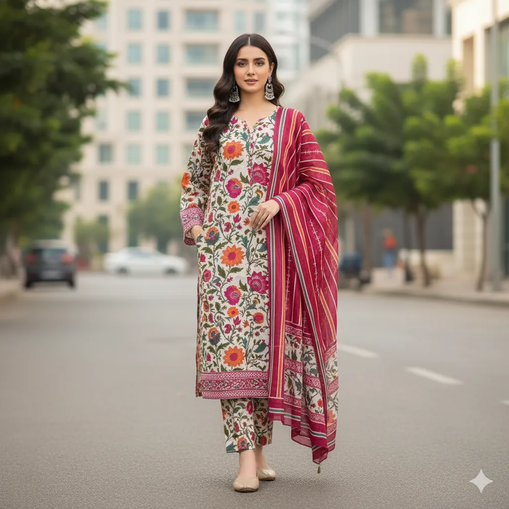 ZEEN 3pc Unstitched Lawn Suit – Cream & Red Floral Print | Summer Collection. Bring freshness and color to your wardrobe with this stunning ZEEN 3pc Summer Lawn Suit (Code: PE05), featuring a beautiful cream base with vibrant red and multicolor floral digital print. The set includes a fully printed shirt front with elegant printed red sleeves, a soft plain trouser, and a lightweight printed lawn voile dupatta – perfect for casual summer wear. Made with premium quality lawn fabric and comes with original ZEEN branding by ARFAT FABRICS.