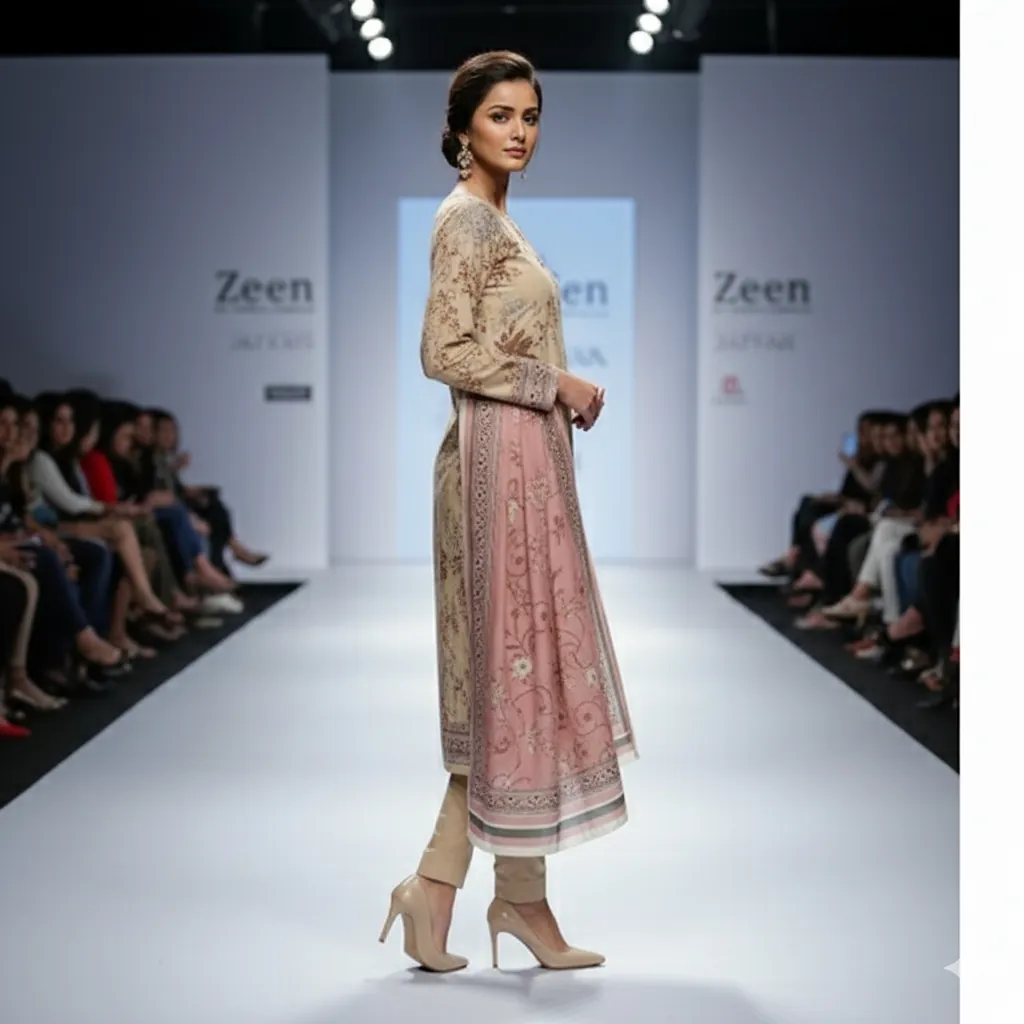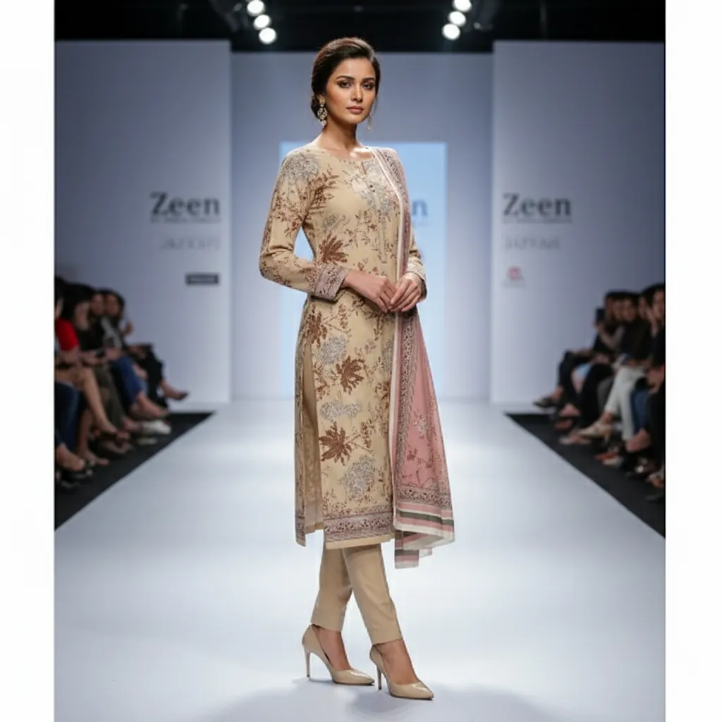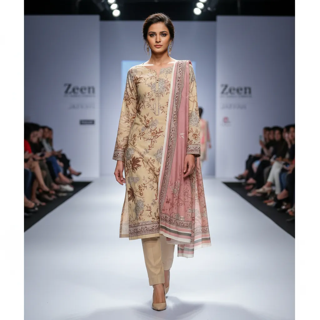 Zeen by Arfat Fabrics 3-Piece Floral Print Lawn Suit - Dusty Pink & Beige Dupatta | Summer Collection, Step into the season with the elegant style of the Zeen by Arfat Fabrics Summer Collection. This 3-piece unstitched lawn suit is a perfect addition to your casual wardrobe. The shirt is crafted from world-class quality lawn fabric and features a beautiful digital print with floral and leafy motifs in brown and grey on a subtle beige background. The set includes a matching lawn voile dupatta with a complementary floral and striped design on a soft dusty pink base. The ensemble is completed with a solid beige trouser fabric, offering a clean and balanced finish. This authentic product is stamped with the "Zeen by Arfat Fabrics" logo, guaranteeing its originality and superior quality.