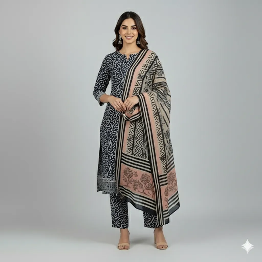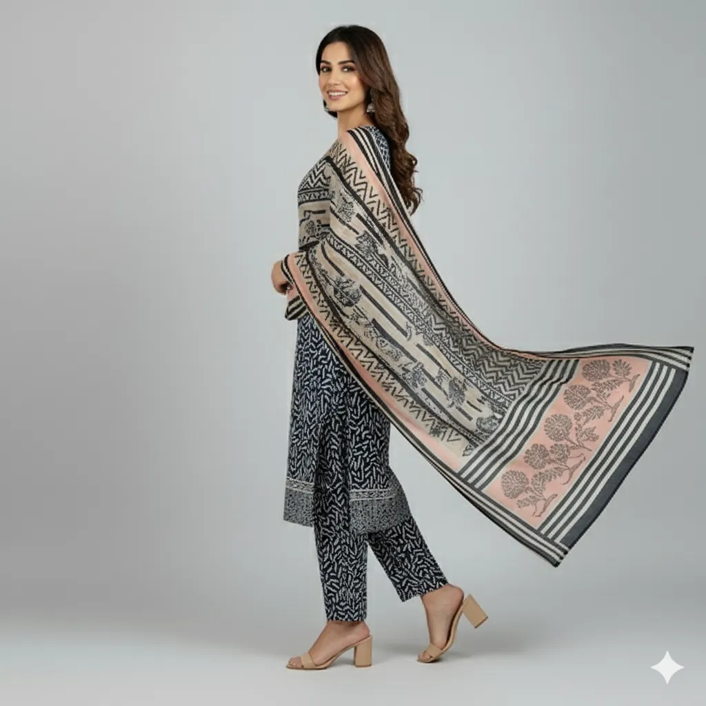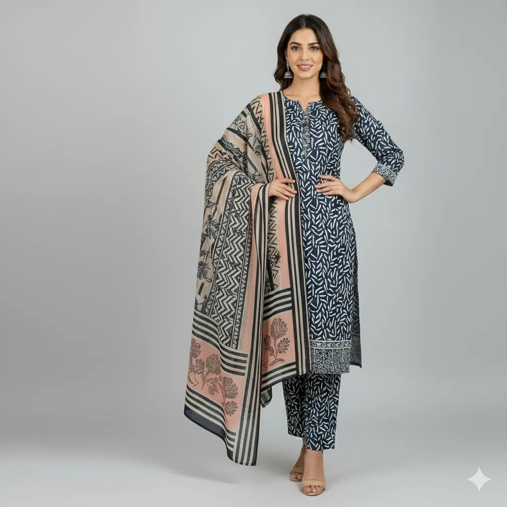 Zeen by Arfat Fabrics 3-Piece Navy Blue & Pink Digital Printed Lawn Suit - Voile Dupatta | PE05. Introducing the Zeen by Arfat Fabrics Summer Casual Collection, Code: PE05. This 3-piece unstitched suit is a summer essential, crafted from best-in-class lawn fabric for superior quality and comfort. The shirt features a full digital print with a beautiful combination of navy blue and pink floral and geometric patterns against a light background. The coordinating printed lawn voile dupatta perfectly complements the shirt, creating a cohesive and stylish look. The suit also includes printed sleeves, allowing you to create a customized and trendy outfit. This authentic product is stamped with the "Zeen by Arfat Fabrics" logo, guaranteeing its originality and quality.