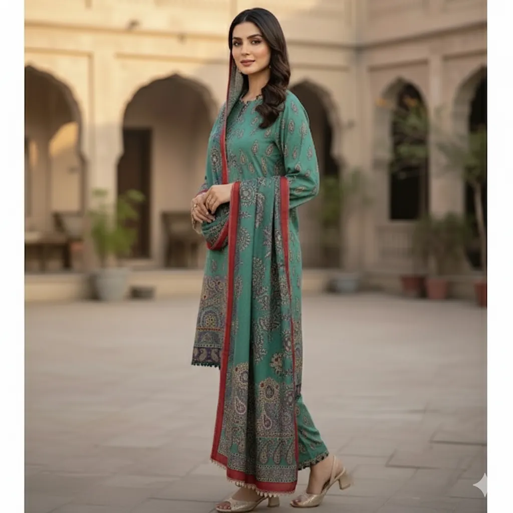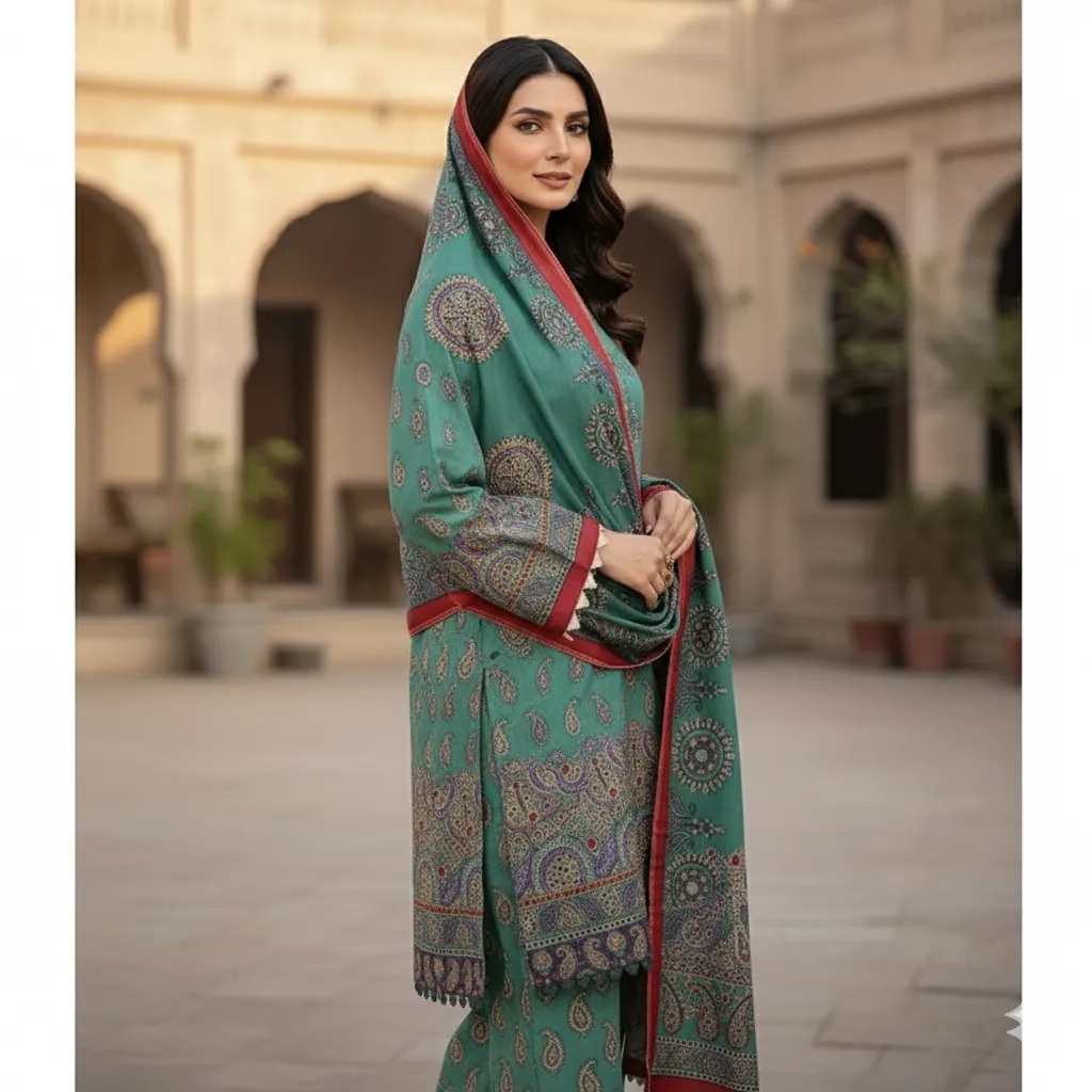 Zeen by Arfat Fabrics 3-Piece Mint Green & Maroon Paisley Print Lawn Suit - Red Border Dupatta | Summer Collection. Step into the season with the graceful style of the Zeen by Arfat Fabrics Summer Collection. This 3-piece unstitched lawn suit is a perfect addition to your wardrobe. The shirt is crafted from world-class quality lawn fabric and features a beautiful digital print with intricate paisley motifs in maroon, purple, and cream on a fresh mint green background. The set includes a matching lawn voile dupatta with a similar paisley design and is finished with a striking red border. The ensemble is completed with a solid mint green trouser fabric, offering a cohesive and sophisticated look. This authentic product is stamped with the "Zeen by Arfat Fabrics" logo, guaranteeing its originality and superior quality.